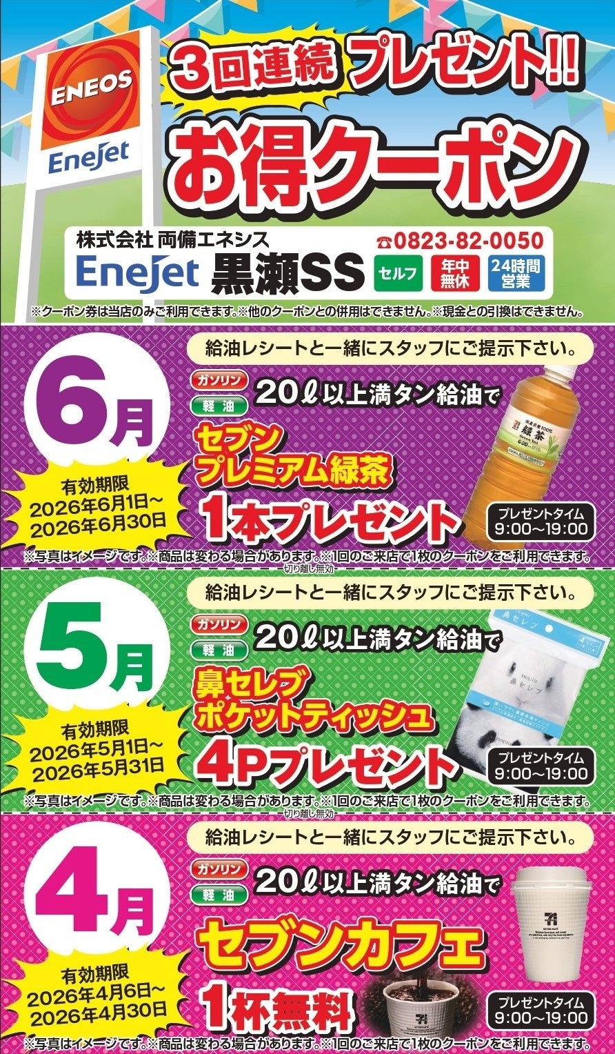 併設のセブン-イレブン黒瀬上保田店にて700円以上お買い上げのお客様に、ガソリン・軽油が「7円/リットル引き」になるチケットをプレゼントいたします。