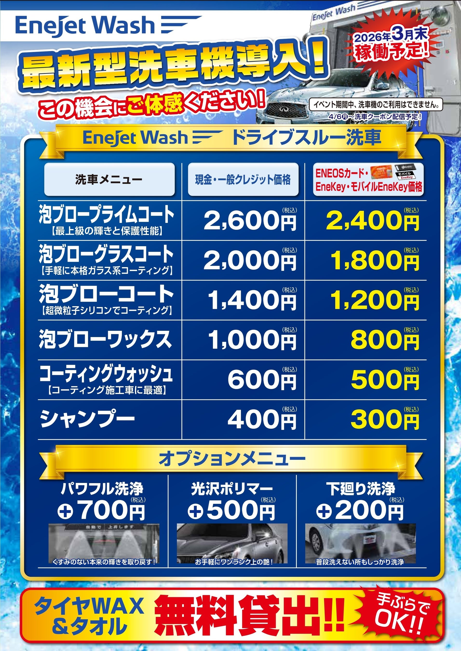 設備:最新型洗車機完備(タイヤWAX&タオル無料貸出)