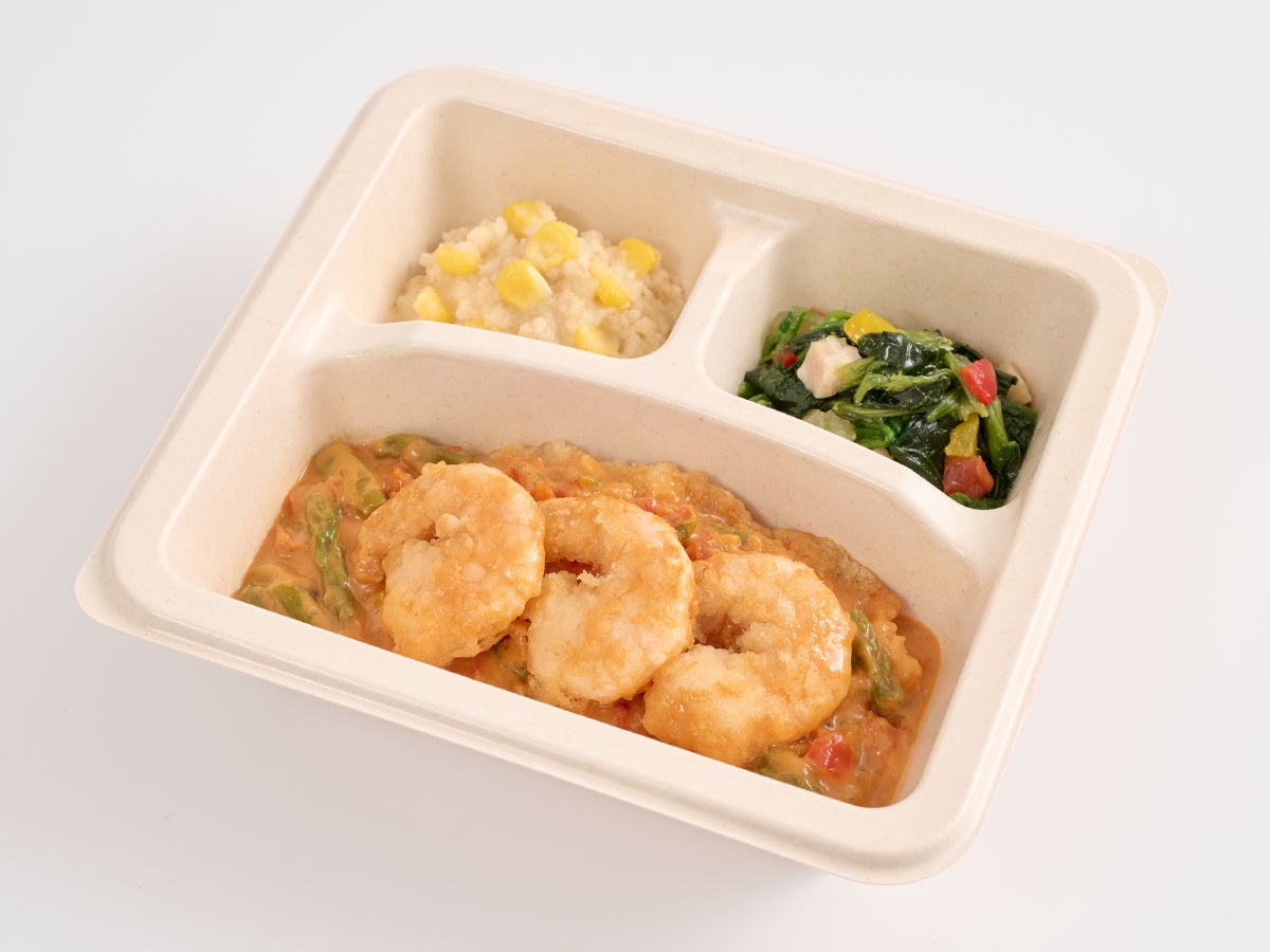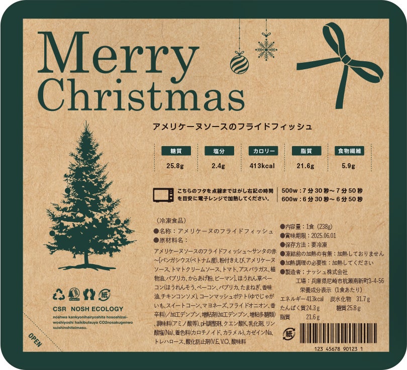 白身魚とエビをふっくらと揚げ、エビの風味豊かな特製アメリケーヌソースを纏わせて特別な味わいに仕上げました。小エビのフライやトマト、アスパラガスを添え、パプリカミックスで赤・緑・白のクリスマスカラーを演出しています。