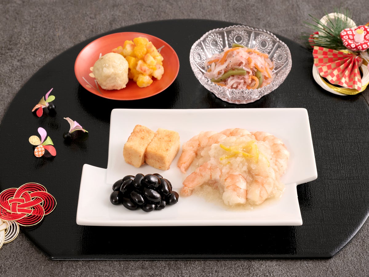 福を招く、1年のスタートにぴったりの逸品です。海老のかぶら蒸しはおめでたい紅白をイメージしており、トッピングに高野豆腐の明太子和えを添えました。海老は「長寿」を、かぶらは「根をおろす」という意味を持ち「安定」を象徴しています。トッピングの黒豆は「健康」と「勝利」を意味し、見た目にも華やかに仕上げました。