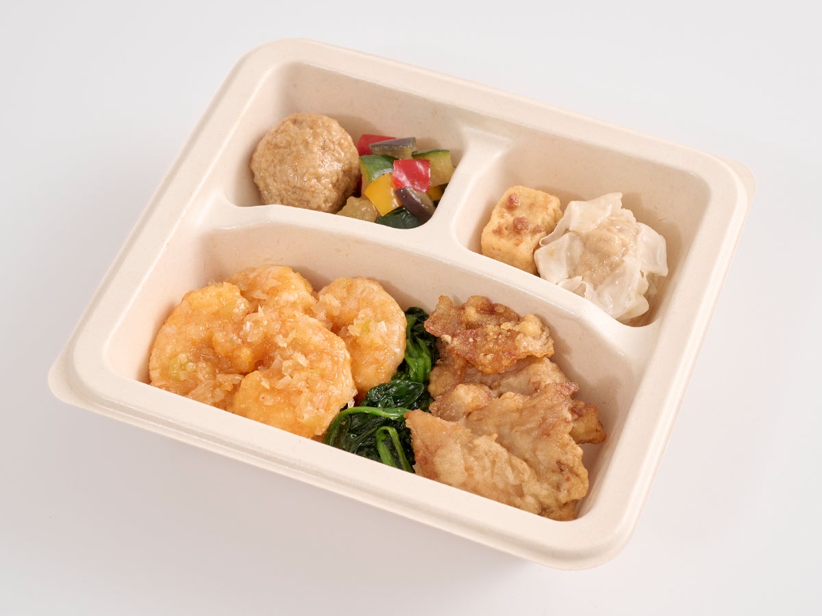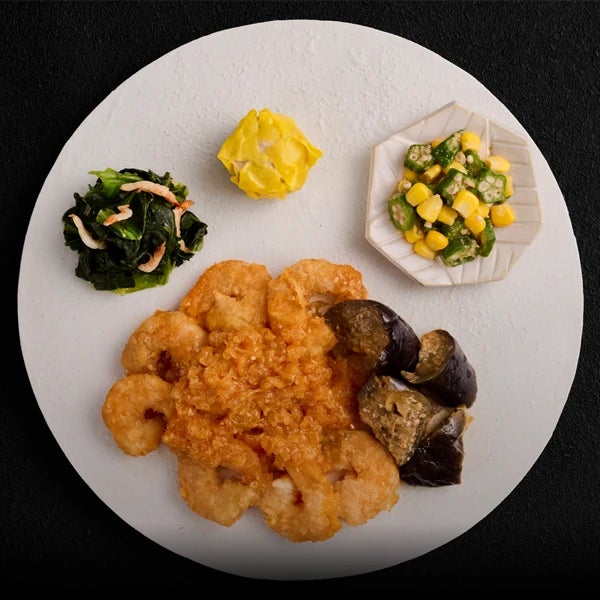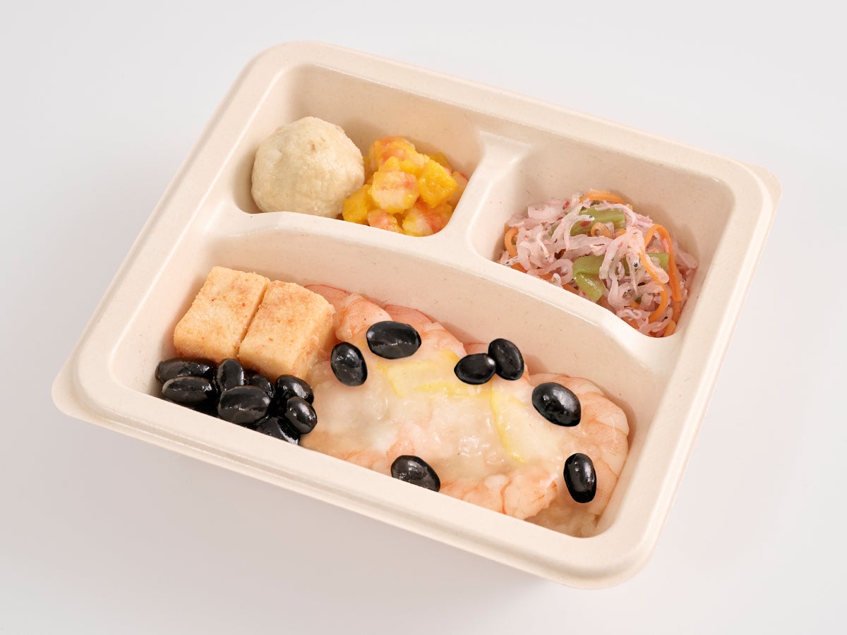 縁起を担ぐ食材を使用し、福を呼び込む意味を込めました。主菜には、「nosh」の人気メニューである「にんにく醤油から揚げ」と、縁起の良いエビを使った「エビチリ」をご用意。甘酢肉団子は、福や喜び、家庭円満の願いを込めて仕上げており、彩り鮮やかな野菜を添えました。副菜は人気の点心をご用意しており、黒豚焼売や麻婆絹揚げを選定しました。複数種類の人気メニューを1プレートで堪能できるボリューム満点の商品です。