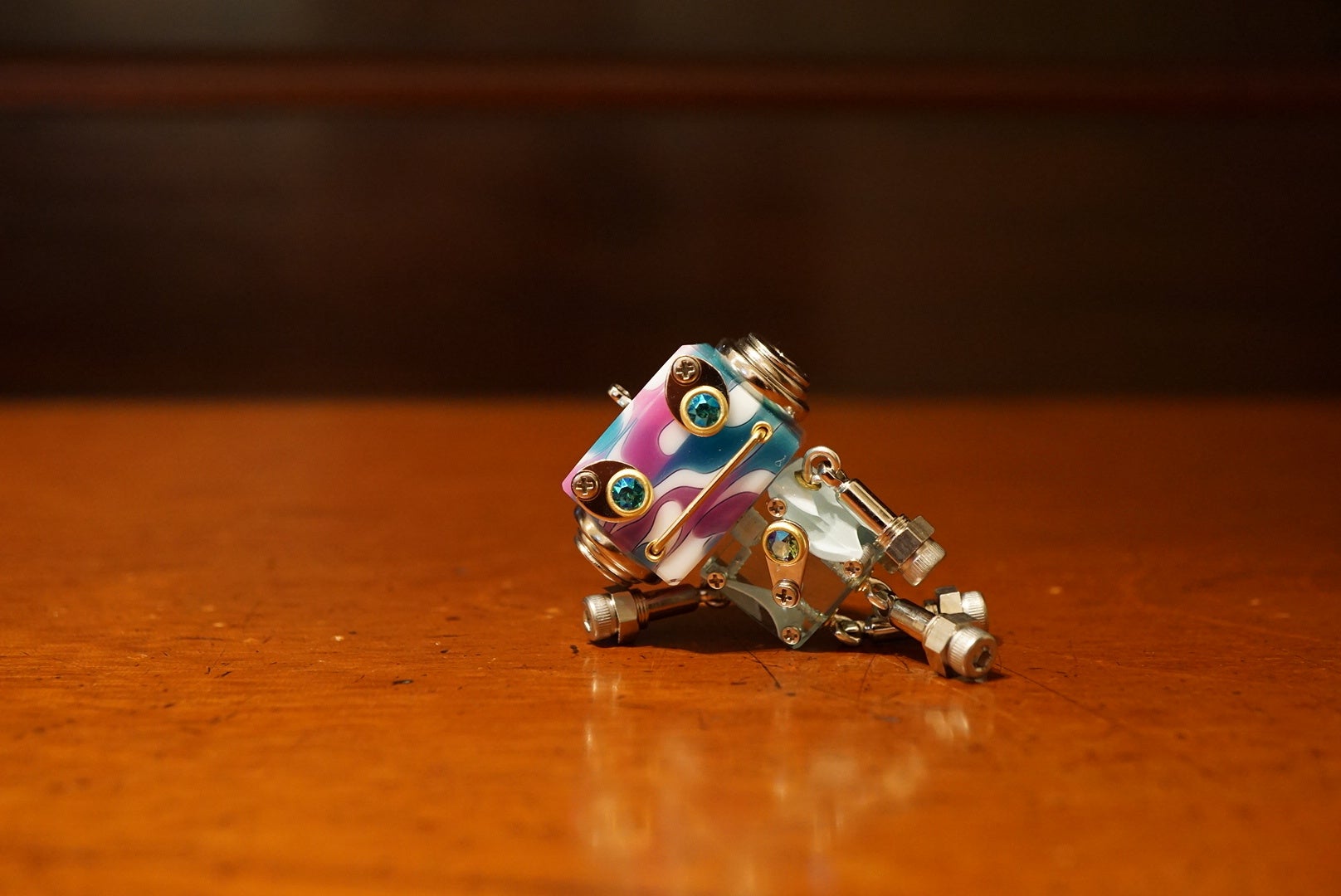 電子機器を扱う町工場を営む父が身近にいた影響で、おもちゃとして遊んでいた工業部品から着想を得たという作品の素材には、ステンレスや鉄、アクリル樹脂の他に、万年筆やボールペンの胴軸材(ペンブランク)を使用。素材そのものの美しさにインスピレーションを受けて製作を続けています。