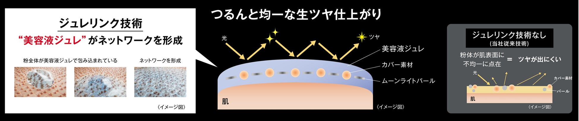 新ベースメイクライン「月夜の海月」は、肌にツヤをとどめる「ジュレリンク技術」や、神秘的な明るいツヤが続く「ムーンライトパール*3」、そして「海洋性美容液成分CP(うるおい成分)*4」の3つが採用されています。月夜のわずかな光の下でも、荒波にもまれても、不死身の“ツヤ”をまとう海月のような美しさと、うるおいをたっぷりたたえた海月のような“生ツヤ”を形成する、神秘的で醒めないツヤ肌へ導く、新ベースメイクラインです。