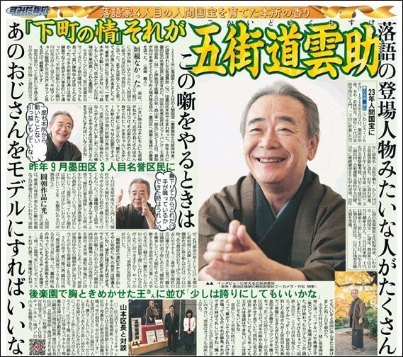 今回は、落語家4人目の人間国宝、五街道雲助が昨年9月にソフトバンク・王貞治球団会長らに次ぐ墨田区3人目の名誉区民に選定されたことを受けて「落語のまち“すみだ”」の大特集です。墨田区には落語の噺(はなし)に出てくるスポットがたくさんあるだけでなく、噺(はなし)家も数多く住んでいる、まさに「落語の聖地」です。