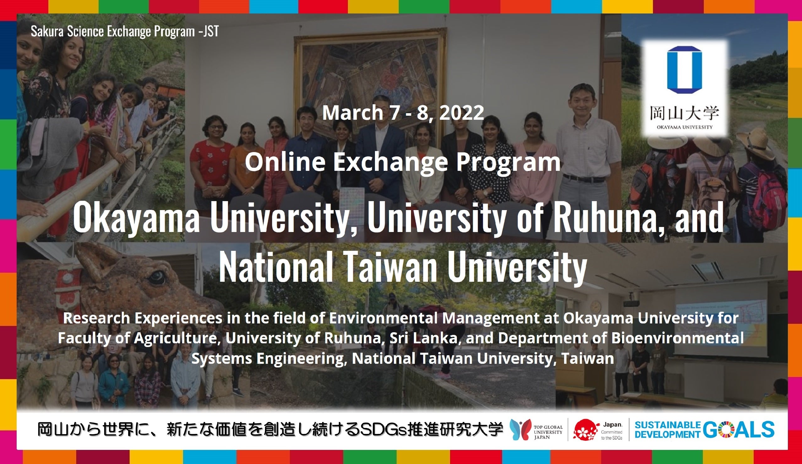 国立大学法人岡山大学(本部:岡山市北区、学長:槇野博史)の大学院環境生命科学研究科(以下、「研究科」という。)は2022年3月7日~8日に、JSTさくらサイエンスプランの助成を受け、「Online Exchange Program between Okayama University, University of Ruhuna, and National Taiwan University ‒ Research Experiences in the field of Environmental Management」を開催しました。岡山大学の学生15名、教員7名、ルフナ大学の学生8名、教員2名、国立台湾大学の学生4名、教員4名が参加しました。