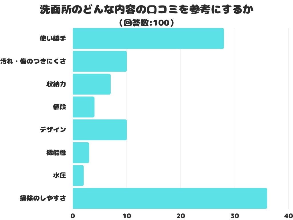 洗面所のどんな内容の口コミを参考にするかをアンケートにて調査したところ、1位は「掃除のしやすさ」でした。