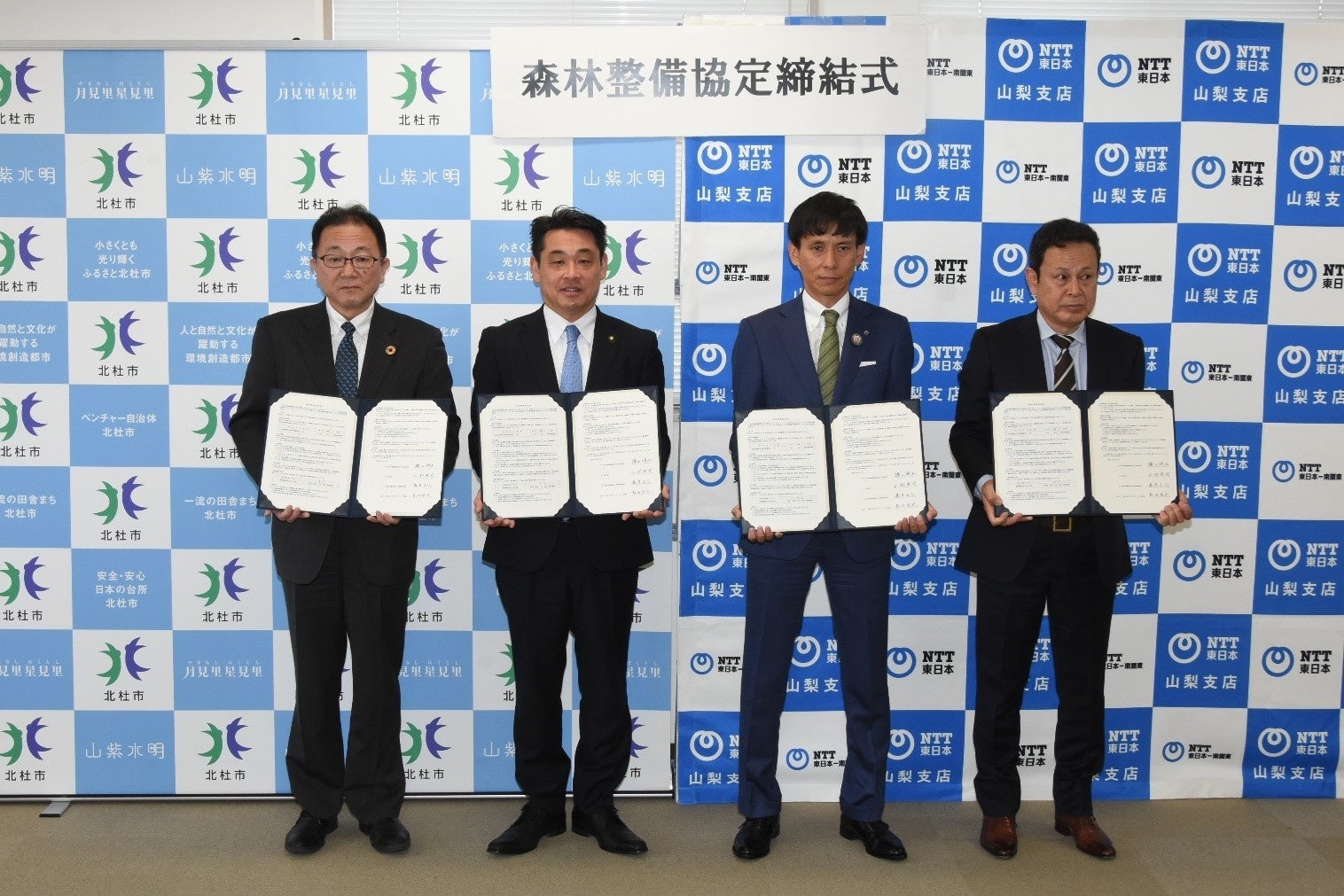 山梨県北杜市(市長:上村 英司 以下、北杜市)、有限会社藤原造林(代表取締役社長:藤原 正志 以下、藤原造林)および東日本電信電話株式会社 山梨支店(支店長:横山 明正 以下、NTT東日本 山梨支店)は、NTT東日本グループの森(仮称)森林整備協定を締結しました。
