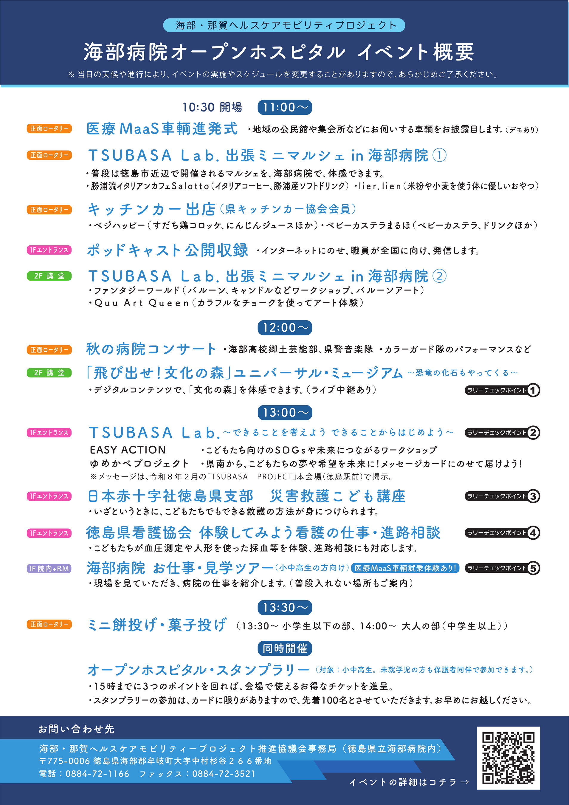 また、この式典と併せて、「オープンホスピタル」として、徳島県立海部病院の事業や業務の内容を地域住民のみなさまにご覧いただくイベントを実施しますので、みなさまのご参加をお待ちしております。