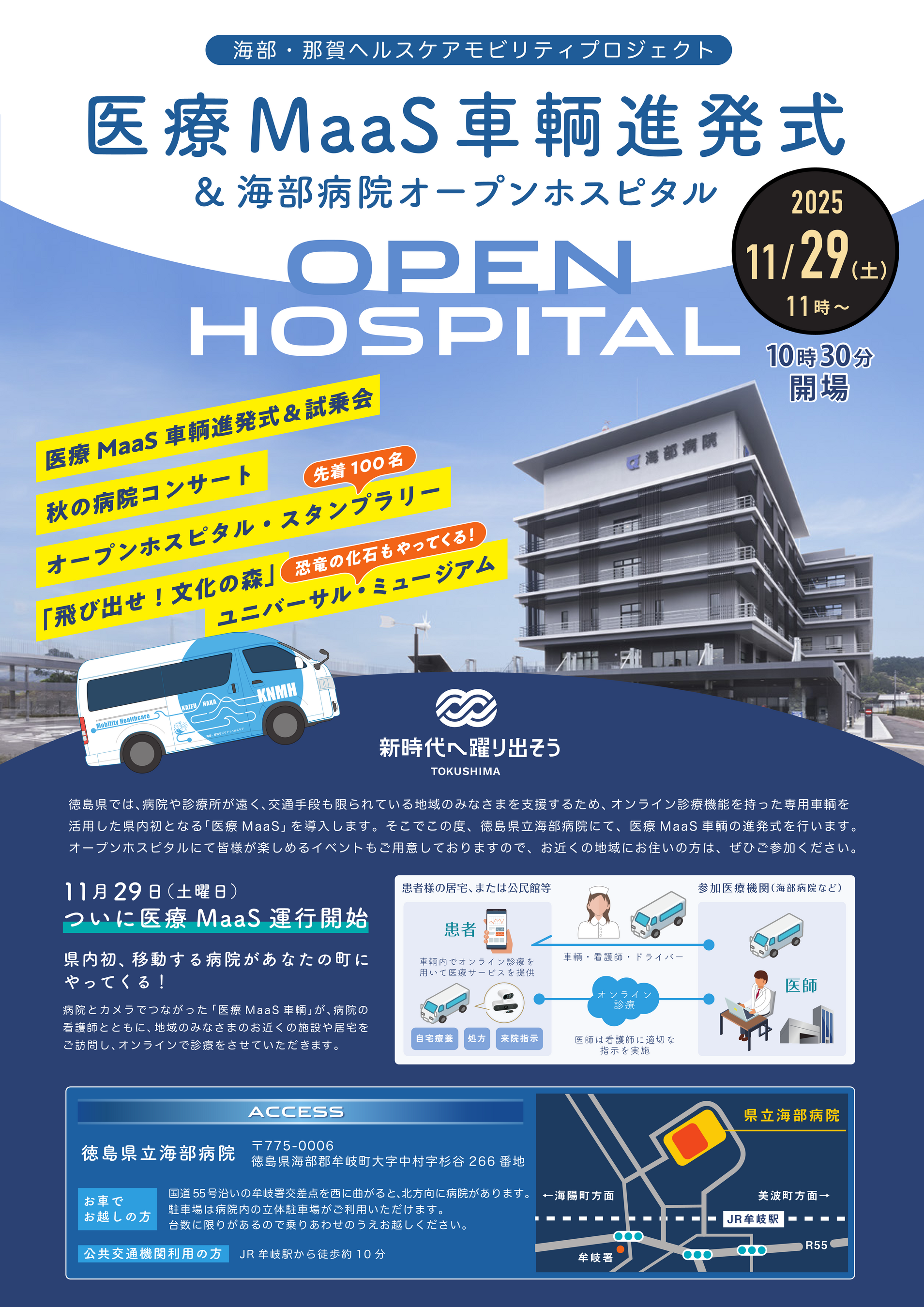 徳島県では、病院や診療所が遠く、交通手段も限られている通院困難な地域のみなさまを支援するため、来る令和7年11月29日より、オンライン診療機能を持った専用車輌を活用した県内初となる「医療MaaS」の運行を開始することとし、徳島県立海部病院にて医療MaaS 車輌の進発式を行います。