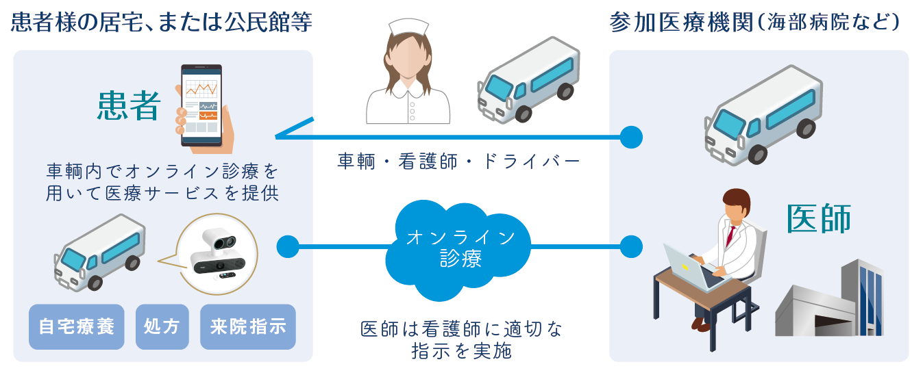 病院とカメラでつながった「医療MaaS 車輌」が、病院の看護師とともに、地域のみなさまのお近くの施設や居宅をご訪問し、オンラインで診療いたします。