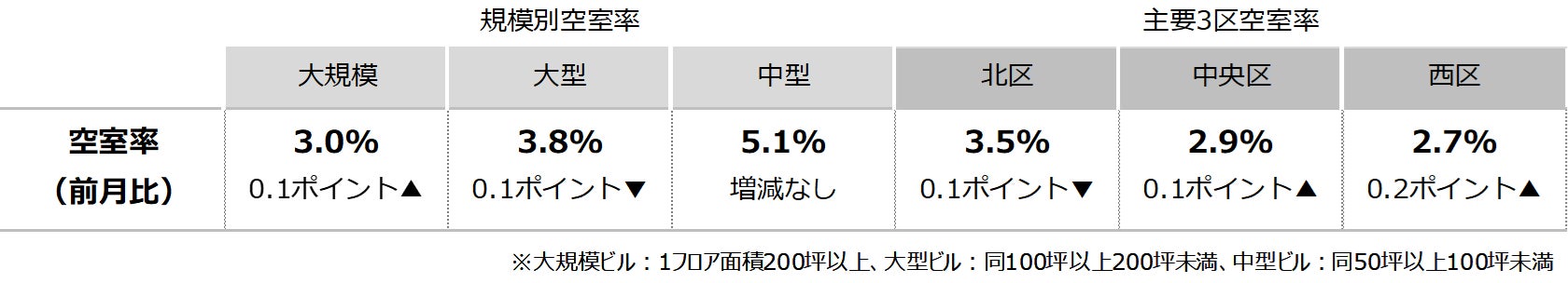 空室率は前月比プラス0.09ポイントの2.99%となり、6ヵ月ぶりで小幅な上昇となった。築年数の経過したビルや周辺部のビルで現空床が生じたことが主な上昇要因となっている。潜在空室率は前月比マイナス0.01ポイントの4.73%となった。