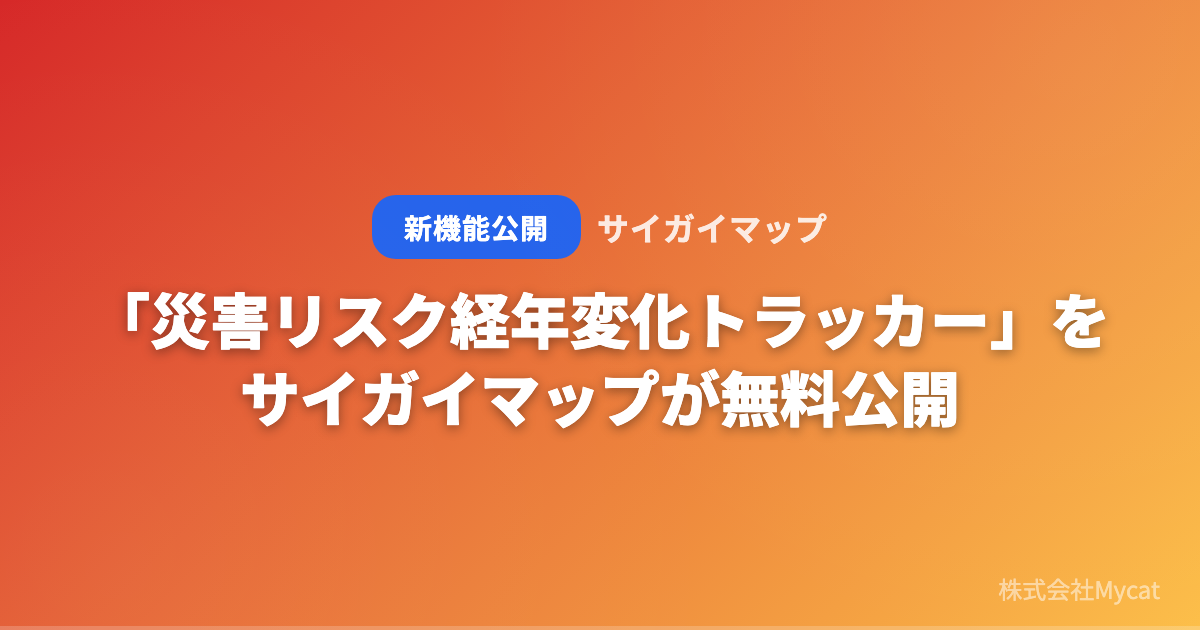 株式会社Mycat(本社:東京都目黒区)は、AI災害リスクスコア診断「サイガイマップ」(https://saigaimap.xyz)において、災害リスク経年変化トラッカー(https://saigaimap.xyz/tools/risk-timeline)を新たに無料公開しました。