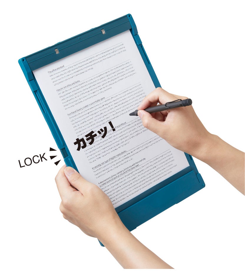書類をコンパクトに折りたためる「コンパック」シリーズは累計82万冊を販売する人気シリーズで、この度新たに「コンパックボード」を追加します。「コンパックボード」は、半分に折りたためるクリップボードです。本体を半分に折りたたみ、ゴムバンドで固定できるため、A4サイズが入らないカバンにも収納できます。また、ボードを開くと自動で筆記面がフラットになり固定されるため、開いた状態で筆記ができます。本体は内側に折りたたむ構造で、書類の中身を見せずに収納することができ、カバンの中で書類を汚れなどから保護します。収納枚数は約15枚で、折り目を付けずに大事な書類もキレイに収納できます。本体に収納可能なペンホルダーも付いており、ペンと一緒に持ち運ぶことができます。工事現場、医療・介護現場、展示会・街頭アンケートなどで活躍します。カラーはアオ、キイロ、シロ、クロの4色展開です。