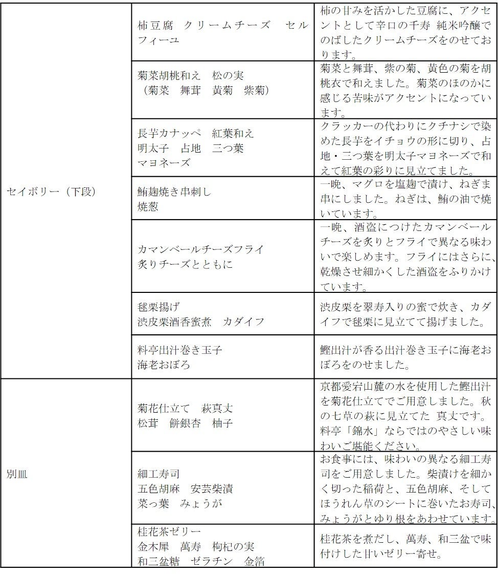 下段のセイボリーは、柿の甘みを活かした豆腐に、「久保田 千寿 純米吟醸」で伸ばしたクリームチーズをのせた「柿豆腐 クリームチーズ」や、軽やかな味わいと上品な甘味が特徴の「久保田 翠寿」が入った蜜で渋皮栗を炊き、トルコ伝統の食材カダイフを付けてイガ栗に見立てて揚げた「毬栗揚げ」など、秋の味覚を存分に感じるメニューを7種ご提供いたします。