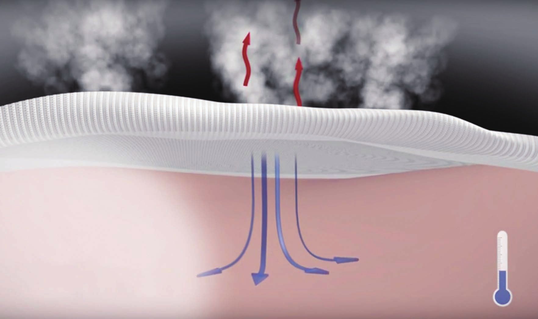 皮膚温に反応して生地が汗を乾かす量を調整し体温をコントロール。暑いときには効率的に汗を蒸散して体温を下げ、寒いときには生地が汗を保持することで気化熱による体温低下を抑えます。