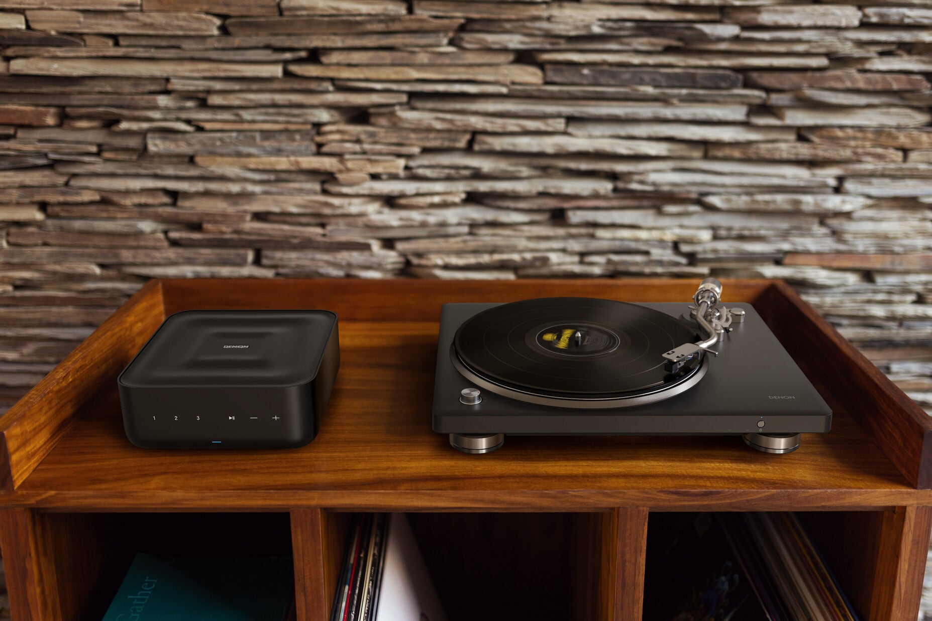DP-500BTは、デノンの伝統をただ継承するだけの製品ではありません。新たにBluetooth送信機能を搭載することにより、レコードの楽しみ方をさらに発展させるプレーヤーでもあります。単体機やアンプ内蔵のフォノイコライザーに匹敵する高音質を誇る新開発の内蔵フォノイコライザーとaptX Adaptiveなどの高音質なコーデックを組み合わせることで、ワイヤレスでも有線接続に匹敵するクオリティのレコード再生を可能にしました。これによって、レコードプレーヤーと接続するオーディオ機器は、これまでのように並べてレイアウトする必要がなくなります。手元での操作が必要なレコードプレーヤーは近くに置き、コンポやスピーカーは離れた場所に配置することも可能です。もちろんBluetooth対応のイヤフォンやヘッドフォンでレコードを楽しむこともできます。音量調整はDP-500BTのフロント右側のボタンからでも、接続したオーディオ機器からでもできるため、音量調整機能を持たない完全ワイヤレスイヤフォンのような機器でもお使いいただけます。