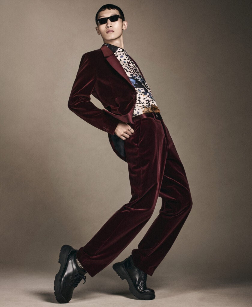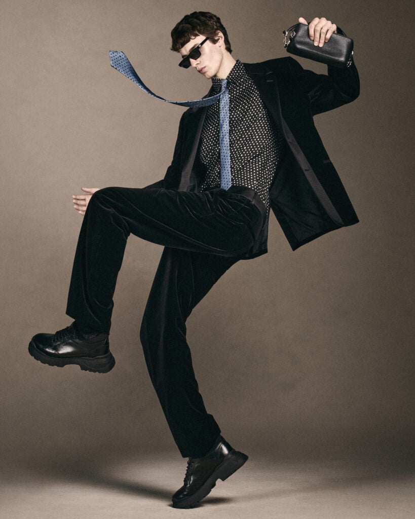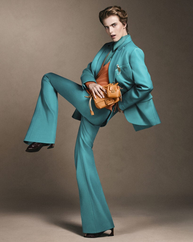 メンズにおいては、シルヴィア・フェンディは、リラックスしたジュエルトーンのレイヤリングと、繊細なクラフトが光る 少年のようなシルエットで、パーティーの世界を広げます。取り外し可能なサテンラペルを配したベルベットのタキシードは、洗練されたカジュアルな夜の装いを演出。バタフライプリントのシャツとジャカードデニムジーンズは クラシックなフォルムに絵画的なテクスチャーを加えています。シリコンボンディングを施したパテントレザーパーカー、ガーメントダイのコーデュロイトラッカージャケットまで、フェンディの卓越した素材使いが随所に光ります。これらはウィメンズコレクションと呼応し合い、大胆で新鮮な組み合わせを生み出しています。