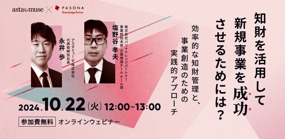 アスタミューゼ株式会社(本社:東京都千代田区、代表取締役社長 永井歩)は、2024年10月22日(火)12:00-13:00に、株式会社パソナナレッジパートナー(本社:大阪市中央区、代表取締役:若本 博隆)と共同で、知財・新規事業担当者に向けた無料ウェビナー「知財を活用して新規事業を成功させるには?〜効率的な知財管理と事業創造のための実践的アプローチ〜」を開催いたします。