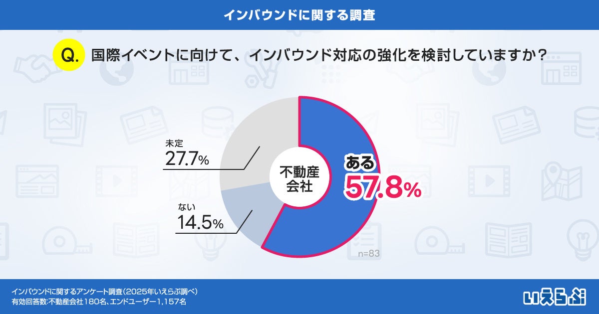 不動産業界特化のDX支援サービスを展開する、株式会社いえらぶGROUP(本社:東京都新宿区、代表取締役:岩名泰介、以下「いえらぶGROUP」)は、不動産会社・エンドユーザーに対して「インバウンドに関するアンケート調査」を実施しました。有効回答1,337件の調査結果を発表します。