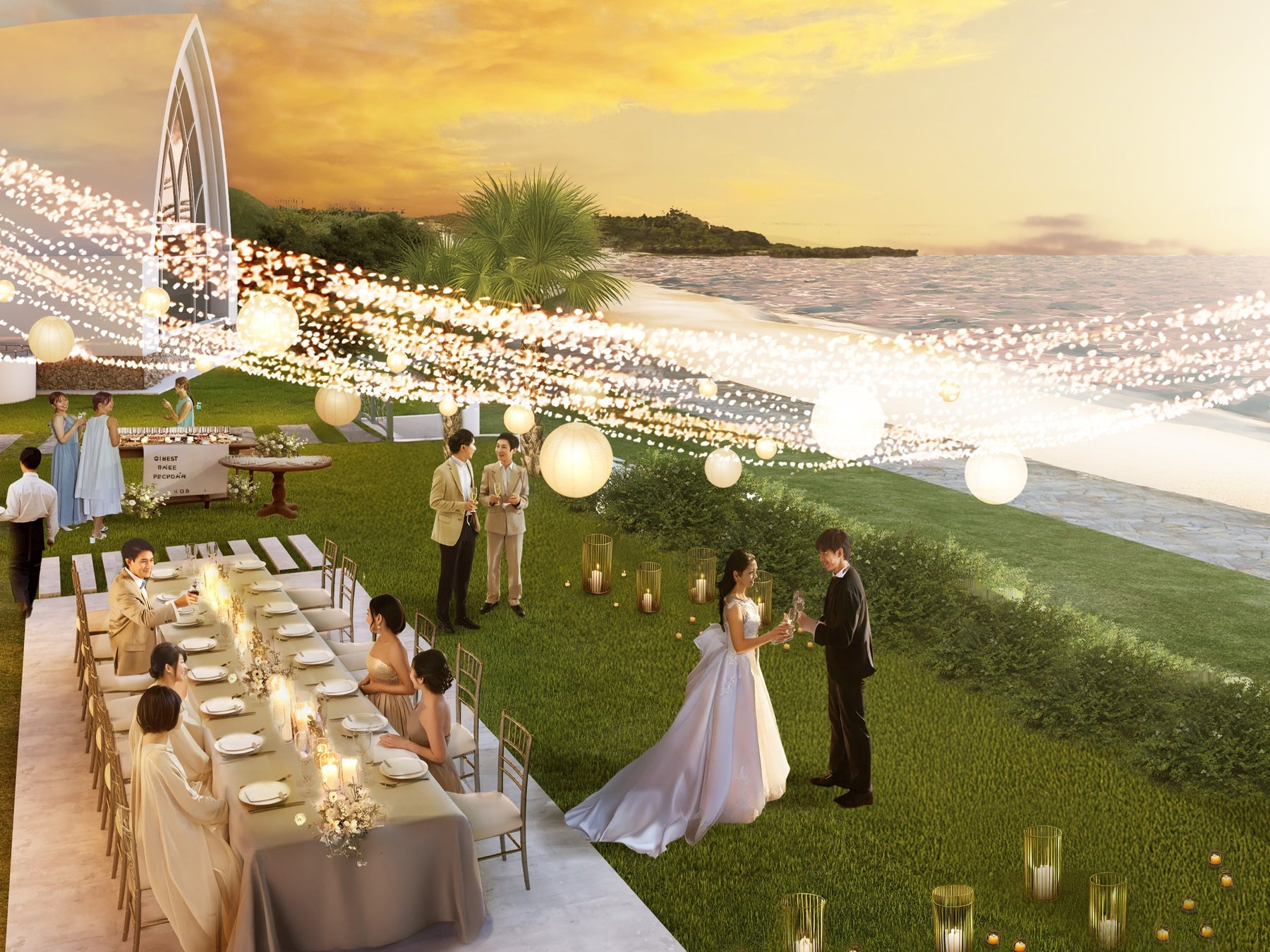 この度販売開始する「トワイライト ガーデン パーティ プラン」は明るいデイタイムからトワイライトタイム、ナイトタイムまで、結婚式の1日を通して、読谷村の移り変わる空や海の景色を堪能いただけます。デイタイムには、空と海とが一体となる祭壇前の大きなガラスが特徴的な完全独立型のチャペルにて挙式、そしてチャペルの前に広がるビーチで撮影を行います。そして、挙式後のパーティは、ゲストと一緒にサンセットフォト撮影や幻想的なライトアップパーティ、ビーチでのんびりと歓談など、段々と空がロイヤルブルーに移り変わるトワイライトタイム~ナイトタイムの景色と共にお過ごしいただきます。また、当プランでは、スクリーンをビーチにセットしてムービー鑑賞や音楽鑑賞、手持ち花火など、ゲストの皆様と一緒に楽しめるオプションを用意しており、プライベート空間で自由度の高いウェディングをお過ごしいただけます。