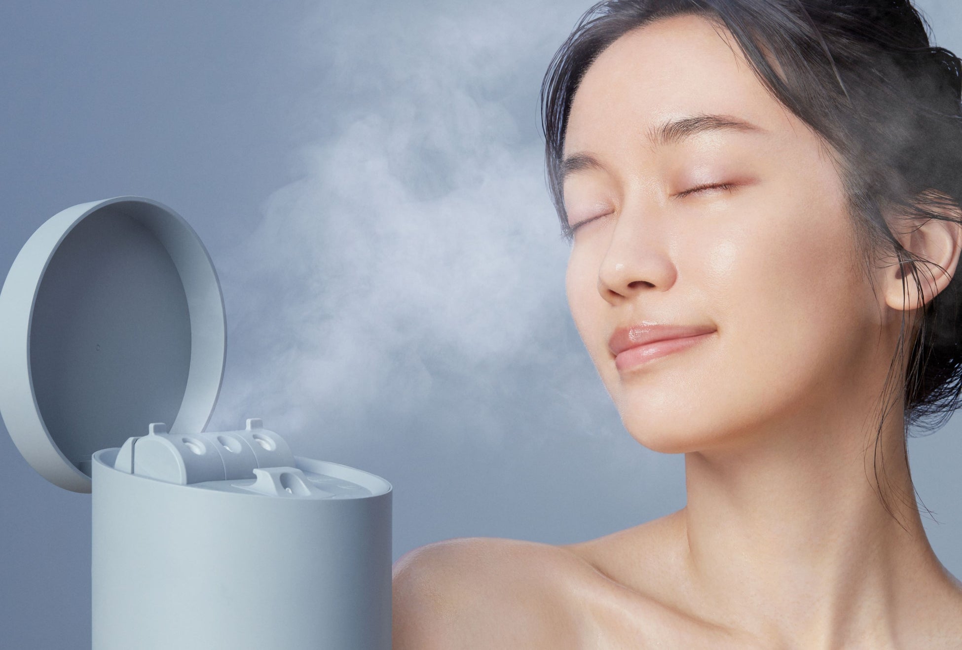 お手持ちの化粧水をミクロサイズの細かいミストに変え、顔全体を包み込むように保湿します。