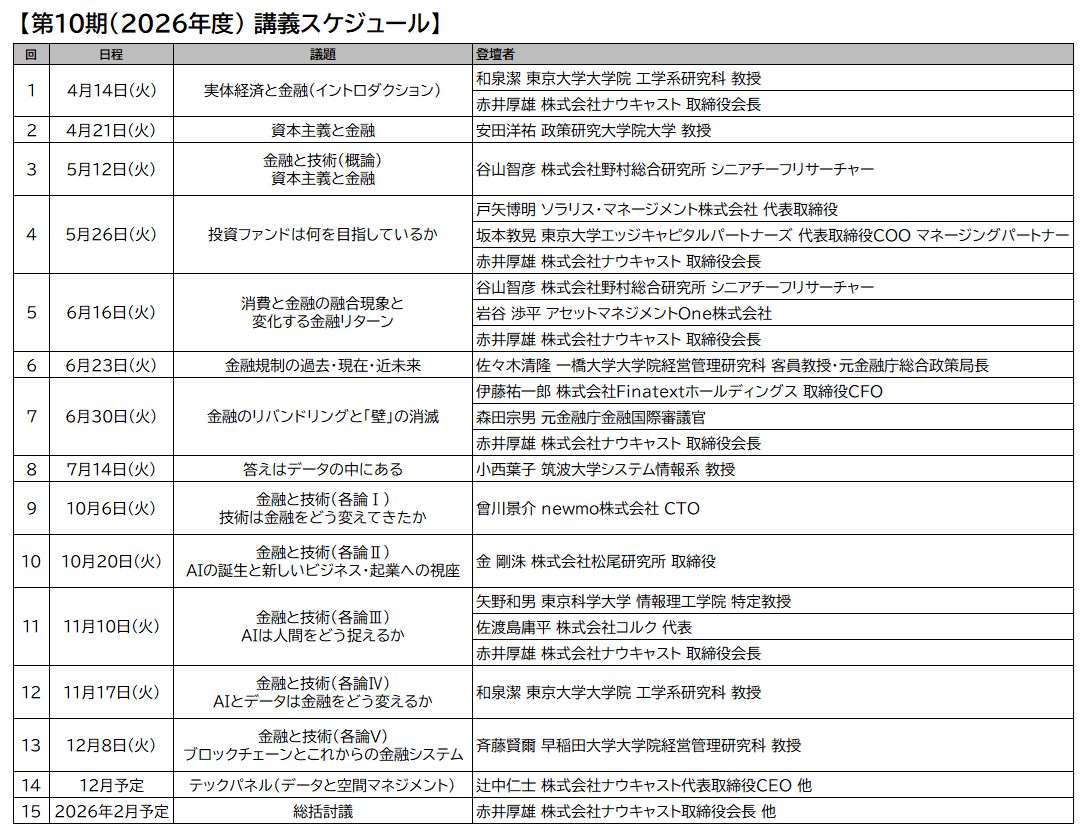 「近未来金融システム創造プログラム」は、Finatextホールディングスが近未来の金融システムを創る中核人材の育成を目的に2017年から毎年開講しているプログラムで、2026年度で10期目を迎えます。株式会社ナウキャスト取締役会長の赤井厚雄がプログラム統括責任者を務めています。