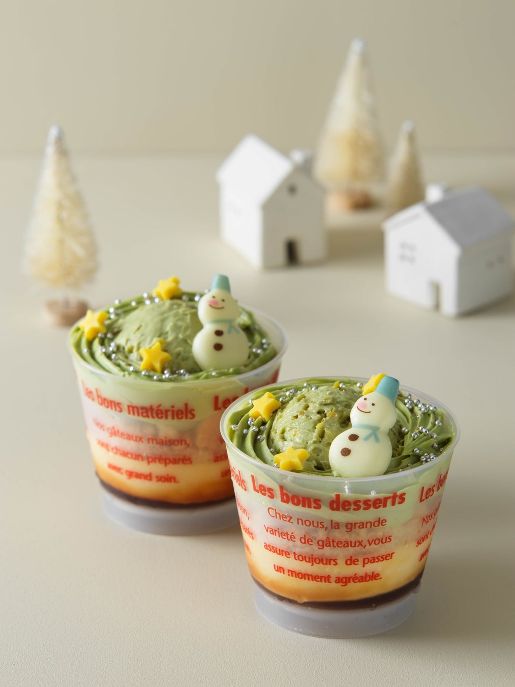 とろっとやわらかいプリン、チーズクッキー、ピスタチオづくしのチーズクリームをピスタチオシャンティでデコレーション。お星さまチョコレートとスノーマンを飾ってかわいらしくしました。