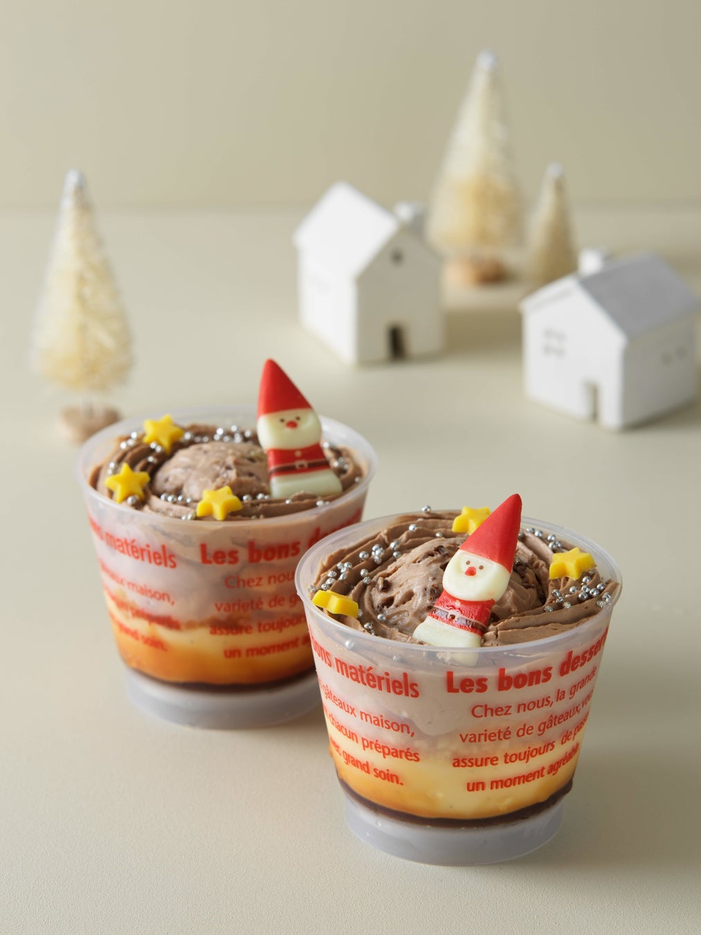 とろっとやわらかいプリン、チーズクッキー、2種のチーズとチョコチップをブレンドしたショコラチーズクリームにショコラシャンティと夜空に輝くお星さまチョコレートとサンタさんを飾りました。