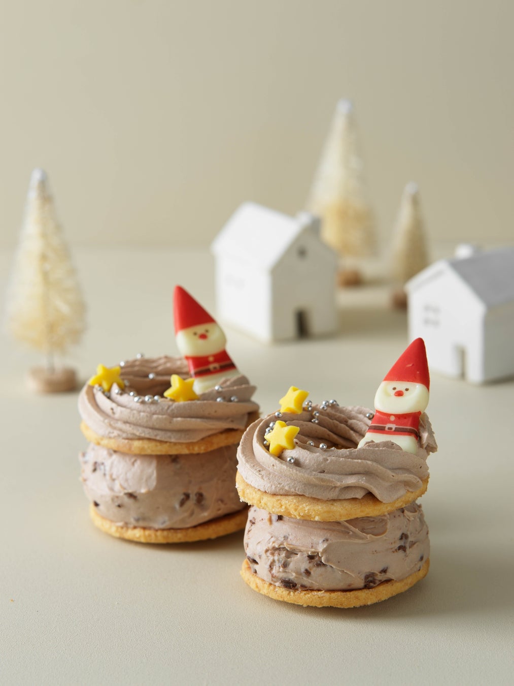 2種のチーズとチョコチップをブレンドしたショコラチーズクリームにショコラシャンティと夜空に輝くお星さまチョコレートとサンタさんをトッピングしました。