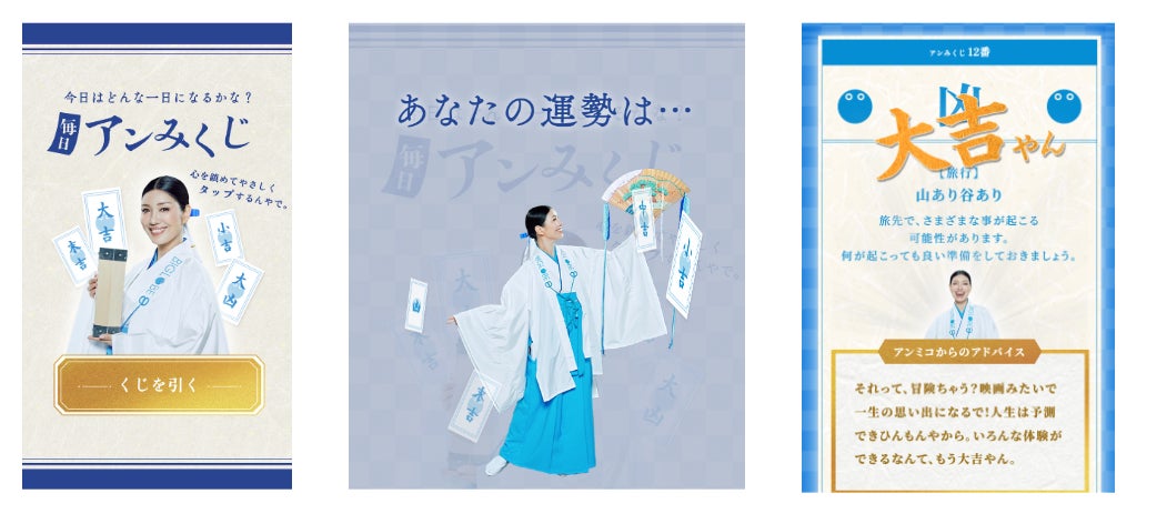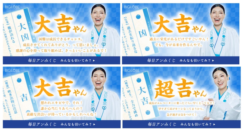 株式会社カヤック(本社:神奈川県鎌倉市、代表取締役CEO:柳澤大輔)は、ビッグローブ株式会社(本社:東京都品川区、代表取締役社長:有泉健)が提供するインターネット光通信サービス「ビッグローブ光」にて、「毎日アンみくじ」プレゼントキャンペーンを2022年10月25日(火)より開始します。「毎日アンみくじ」とは、モデル・タレントのアン ミカさんが巫女「アンミコ」となり、持ち前の前向き思考でポジティブにユーザーの運勢を占ってくれるおみくじコンテンツです。大凶や凶、吉などさまざまな吉凶に対して、アンミコが超ポジティブ思考で、全てを強引に大吉へと変えてくれます。Aamazonギフト券が当たる本プレゼントキャンペーンは、アンみくじを引いて、Twitterにシェアすることで参加できます。