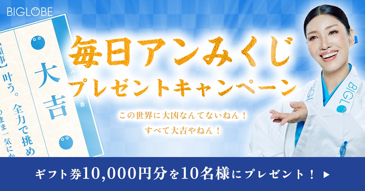 | 参加方法 | ①毎日アンみくじをひく ②結果とともに「#アンみくじ」をつけてTwitterでシェア ※当選の結果はTwitterのDMで行います。連絡のために、BIGLOBE公式Twitterアカウント(@BIGLOBE)をフォローください。 (https://twitter.com/BIGLOBE) |