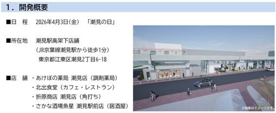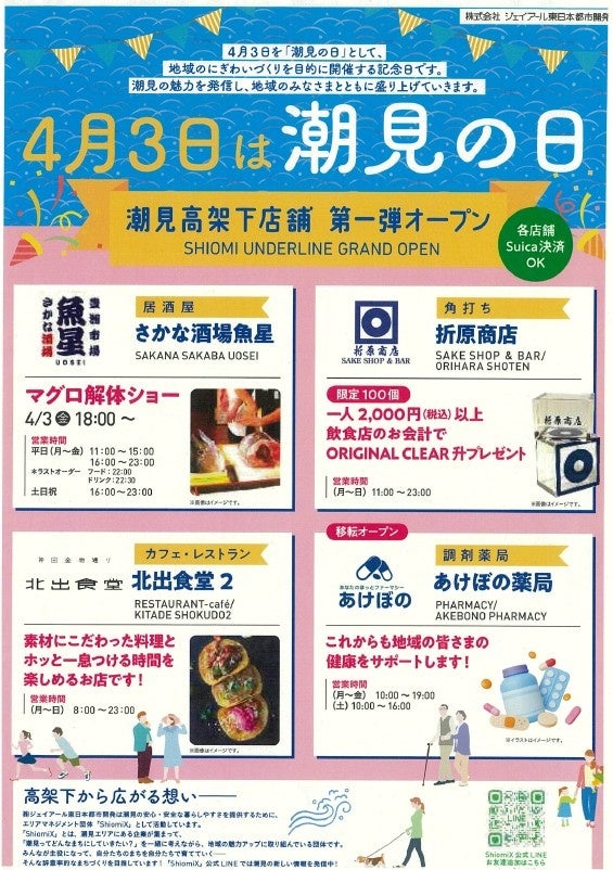 株式会社ジェイアール東日本都市開発(本社:東京都渋谷区代々木2-2-2 代表取締役社長:根本英紀)は、2026年4月3日(金)「潮見の日」に潮見高架下に4店舗開業いたします。本開業により飲食・サービスなど多様な業種が集積し、地域の利便性向上および駅周辺のにぎわい創出を図ってまいります。