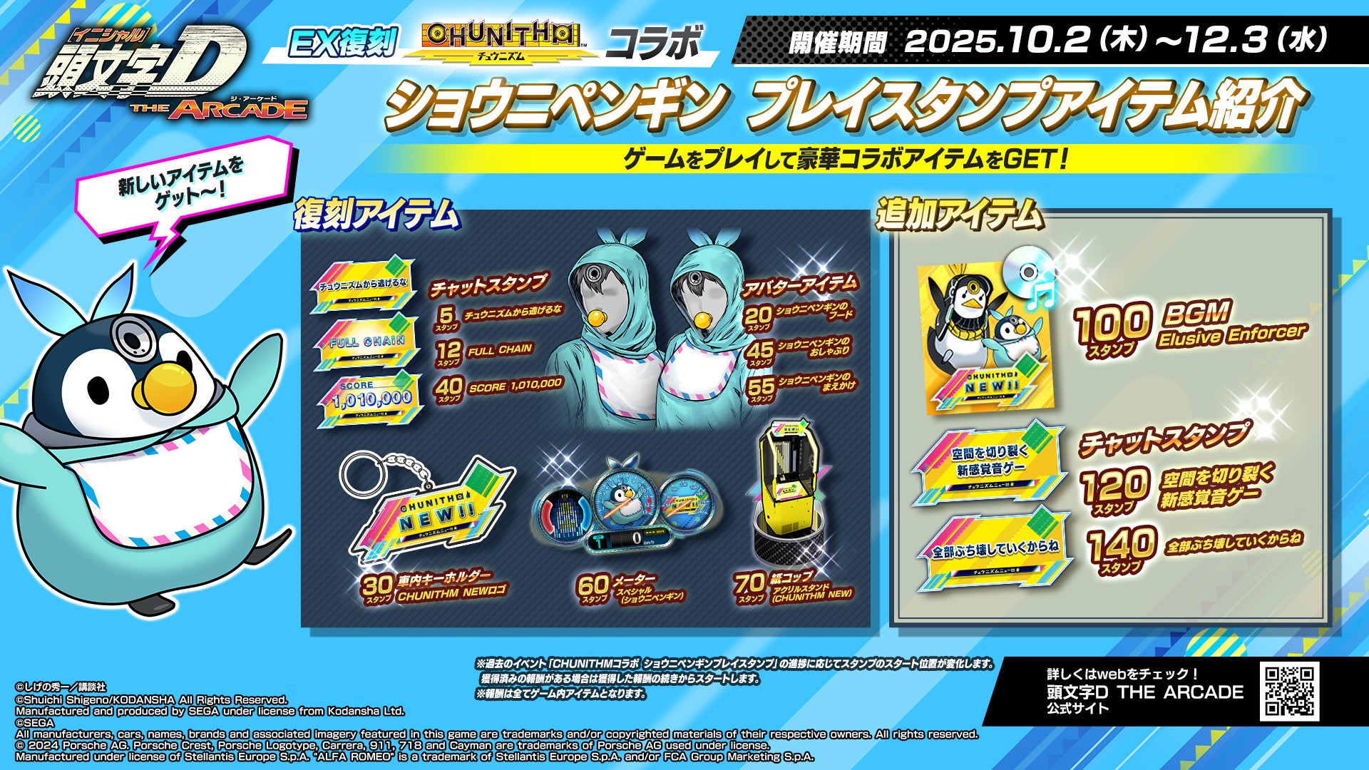 株式会社セガ フェイブ(本社:東京都品川区、代表取締役社長執行役員:杉野行雄、以下 セガ フェイブ)は、アミューズメント施設向けタイトル『頭文字D THE ARCADE(以下、頭文字DAC)』におきまして、2025年9月25日(木)より、『CHUNITHM』コラボEX復刻を開催いたします。