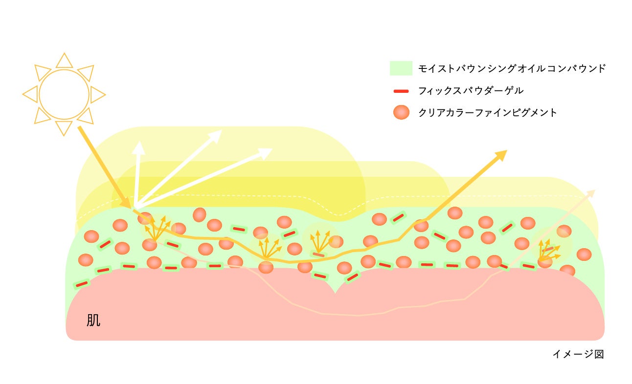 肌のキメなどの凹凸に緻密に密着する「フィックスパウダーゲル」を、肌となじみのよい濃密な「モイストバウンシングオイルコンパウンド」で包み込み、肌への密着性が高い鮮やかな発色の「クリアカラーファインピグメント」と均一分散する技術です。