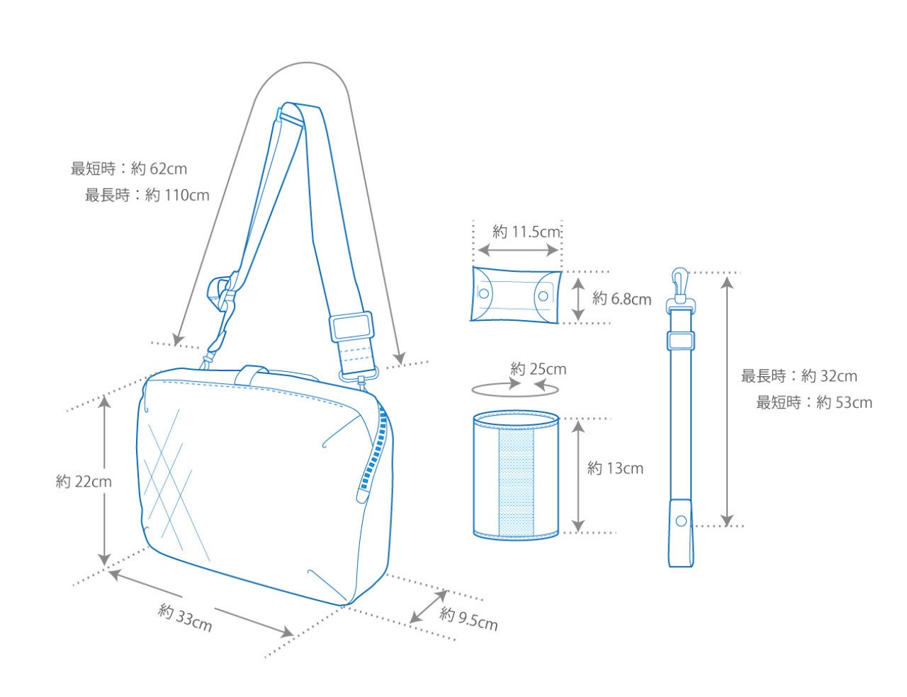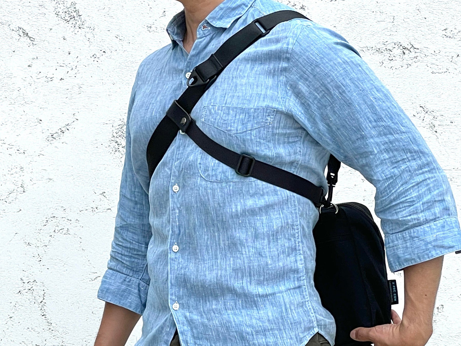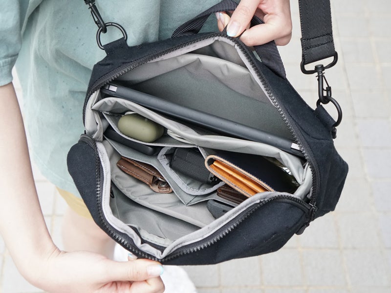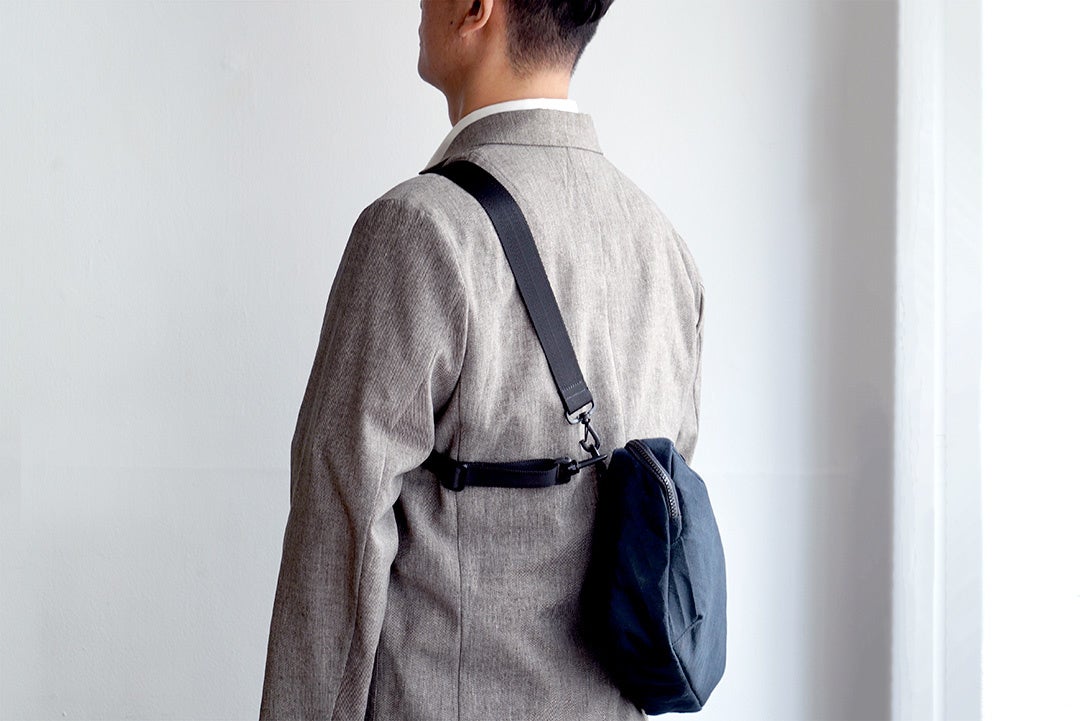 ループに親指を差し込んで上下させることで、素早くストラップの全長を伸縮できるギミック「サムスライダー」を採用。TPOに合わせ、縮めて体にタイトに纏うボディバッグスタイルにも、伸ばしてショルダーバッグスタイルにも変形可能です。