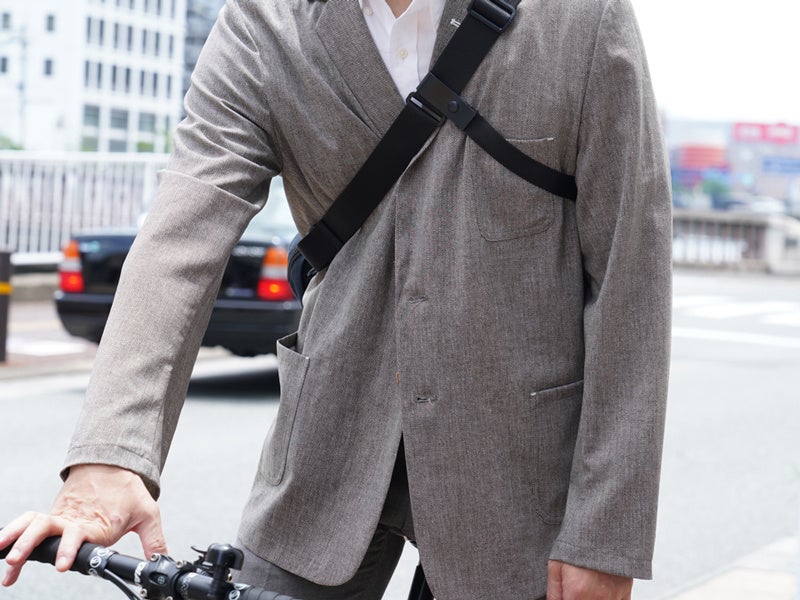 前傾姿勢が強くなるロードバイクやクロスバイクの乗車時に、背中に回したバッグが振動で前面に回転してこないよう、バッグを背中に固定するクロスストラップを標準装備。夏場や冬場は、重ね着用のアウターを引っ掛けておくためのロープとしても使用できます。