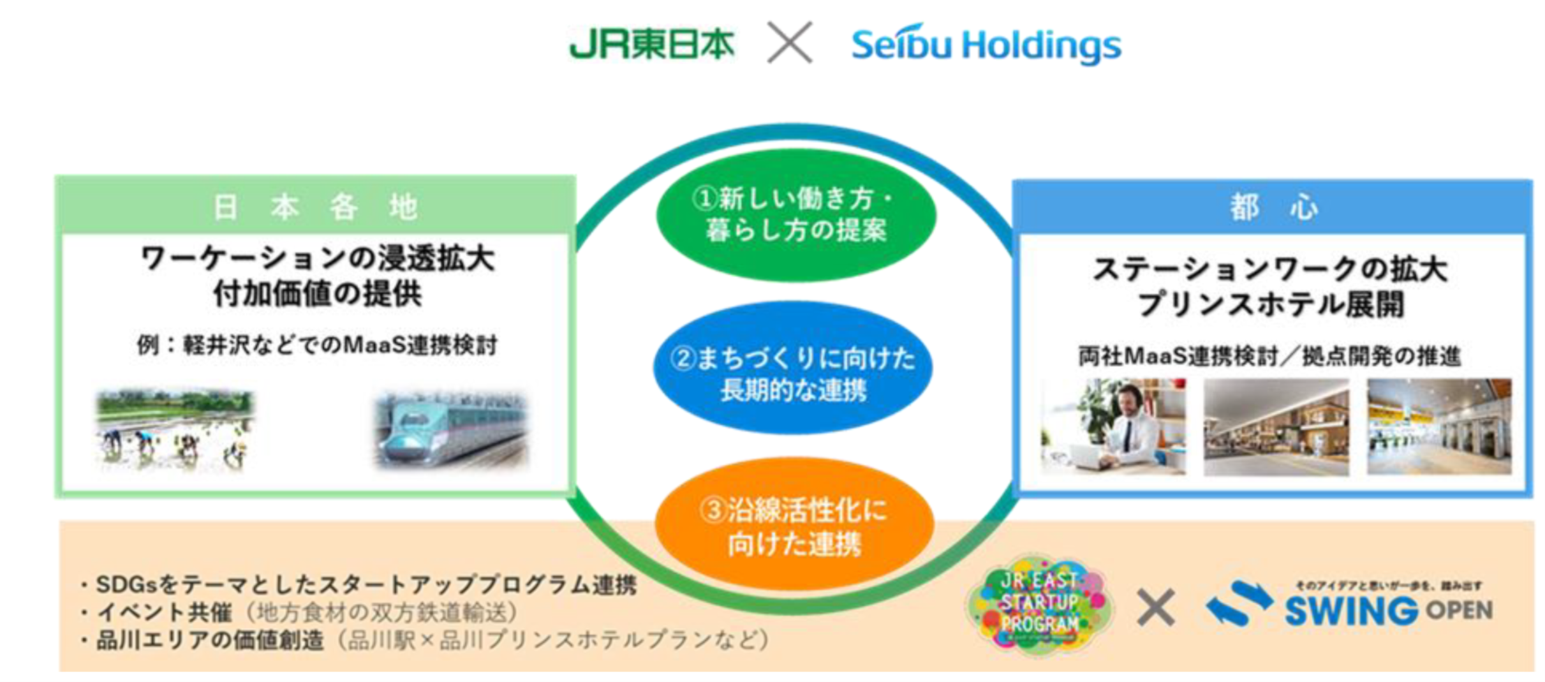 JR東日本と西武 HDは、両社が持つ有形無形の資産を組み合わせた包括的な連携を行います。これにより、今までにない新しいライフスタイルを生み出すとともに、この取り組みを首都圏から地方へとつなげ、移動の活性化や関係人口の増加を図り、地方創生につなげていきます。