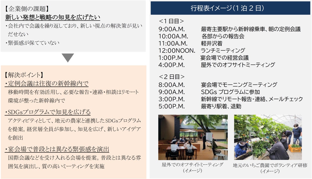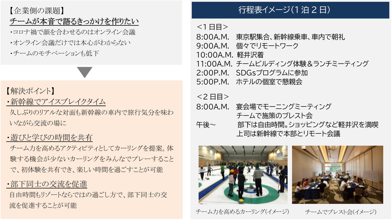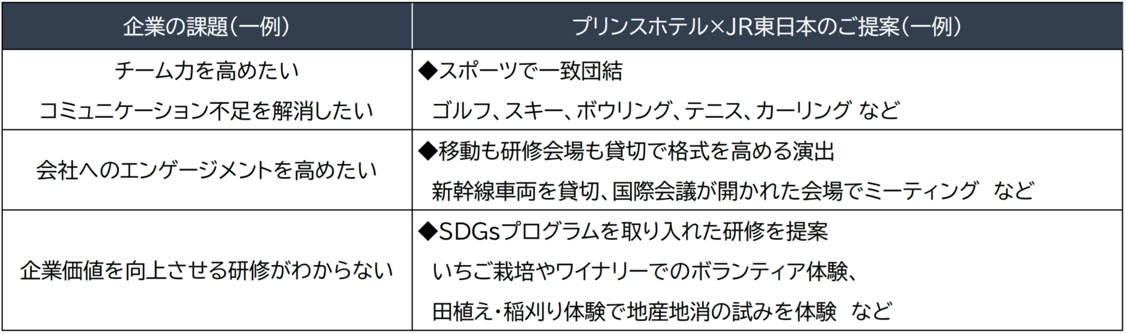 2023年度より企業の人的資本開示の義務化をはじめ、企業の「人への投資」が注目を集める一方で、コロナ禍による人材確保や人材不足に課題を感じる企業が増加しております。これを背景に、プリンスホテルとJR東日本は、両社のサービスや地域との連携を生かし、各企業の人材育成ニーズに柔軟に対応したワーケーションスタイルでの「チームビルディング研修」をご提供いたします。まずは軽井沢・苗場・大磯のプリンスホテルにおいて、企業価値向上につながる研修プログラムやそれぞれの地域の特徴を生かしたSDGs体験などをご提案いたします。さらにMICEの運営ノウハウを生かしたセールスチームが企業の要望に合わせた研修プログラムの提案や手配、受け入れ態勢の整備などワンストップで対応することで、企業側の負担軽減を目指したサポートを行ってまいります。
