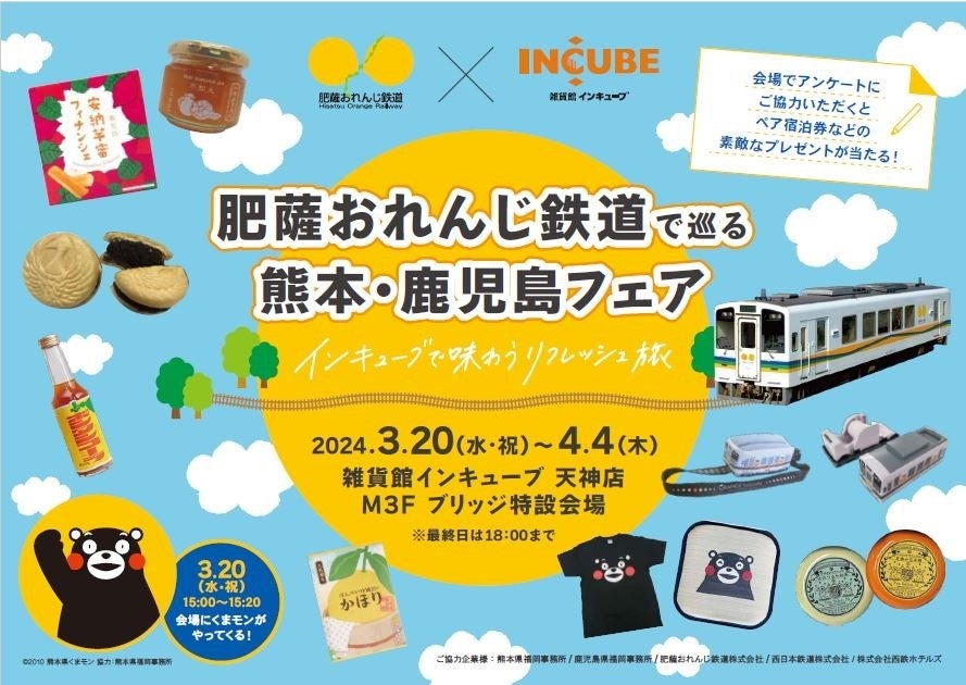 会場には、肥薩おれんじ鉄道、くまもんグッズをはじめ同路線の停車駅「八代、水俣、(熊本県) 出水、阿久根、川内、(鹿児島県)」の食品や雑貨など約130種類の逸品が大集合します。また、沿線に広がる名所や見どころを紹介するパネルを会場に設置。商品と共に地域の魅力を発信いたします。その他、3月20日(水・祝)には、「くまモン」の来店や、期間中会場の商品をお買い上げの上、アンケートに回答いただくと熊本・鹿児島を堪能できる素敵なプレゼントが当たる抽選会にご参加いただけます。肥薩おれんじ鉄道沿線地域に広がる魅力をぜひ会場でお楽しみください。