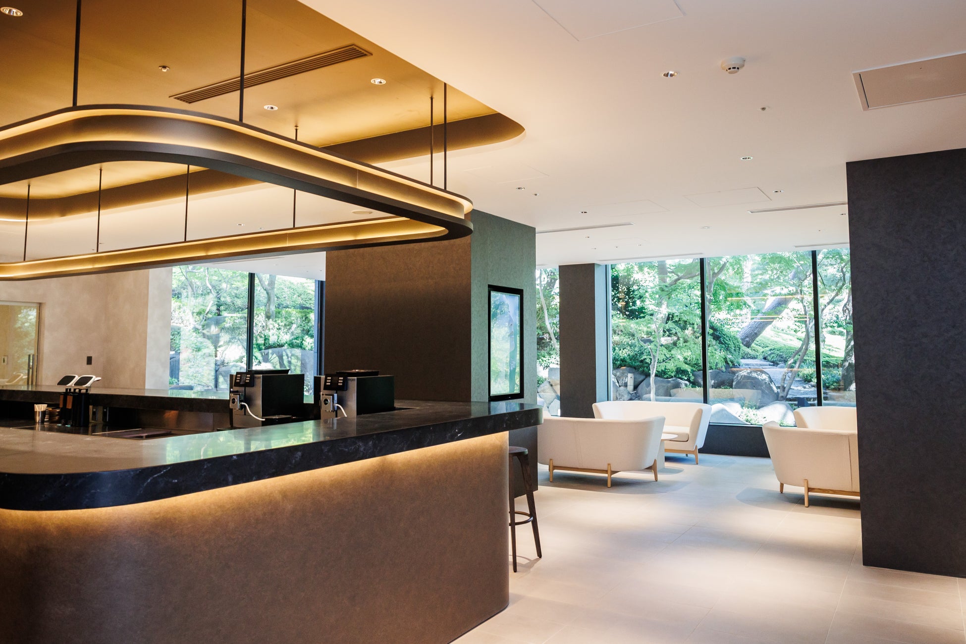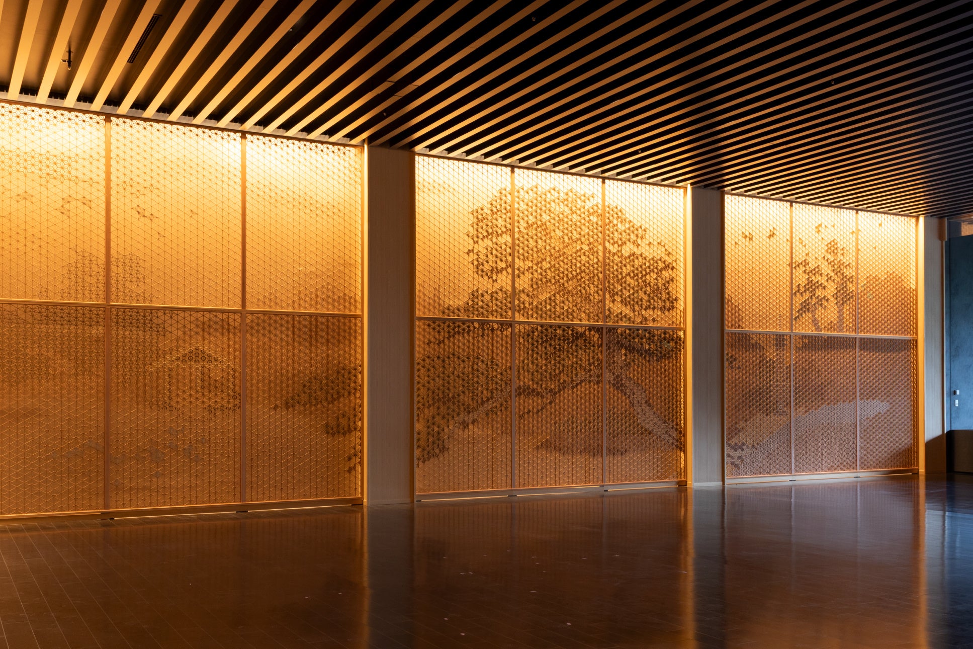 「日本の、美意識の凝縮」というリブランディングコンセプトのもと、まるで日本庭園へとつながるかのような空間に生まれ変わったメインロビー。壁面は職人の技と伝統美が息づく組子アートで彩られ、圧巻の伝統美に包まれる空間が訪れる人を迎えます。