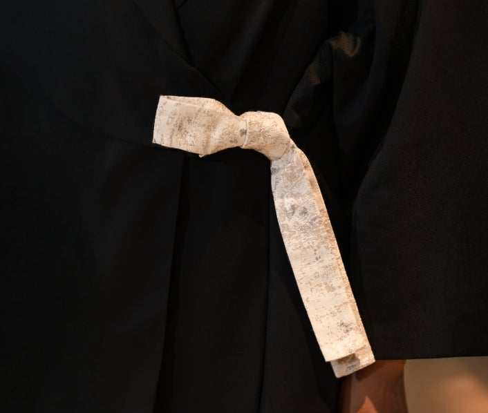 コンシェルジュセクションの新ユニフォームの素材には上質なウール100%を採用。八芳園の“顔”としておもてなしの価値を高めていくセクションにふさわしい信頼感と品格を追求しました。なだらかに落ちる肩のラインや、ミニマルに重ね合わせた襟元は、着物のシルエットを彷彿させます。また、西陣織の老舗「HOSOO」のファブリックを用いたくるみボタンをあしらい、都市庭園に調和する節度ある華やぎと、所作の美しさを引き立てるディテールで「日本の美意識を纏う」を体現します。