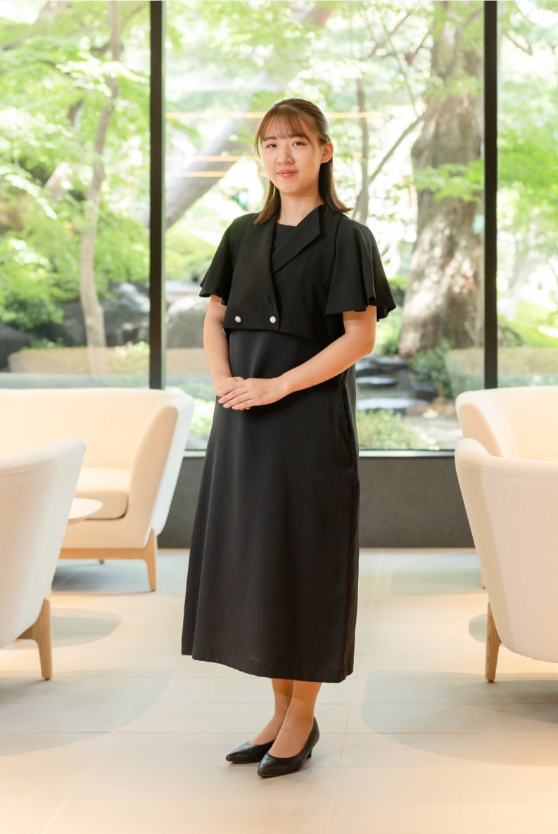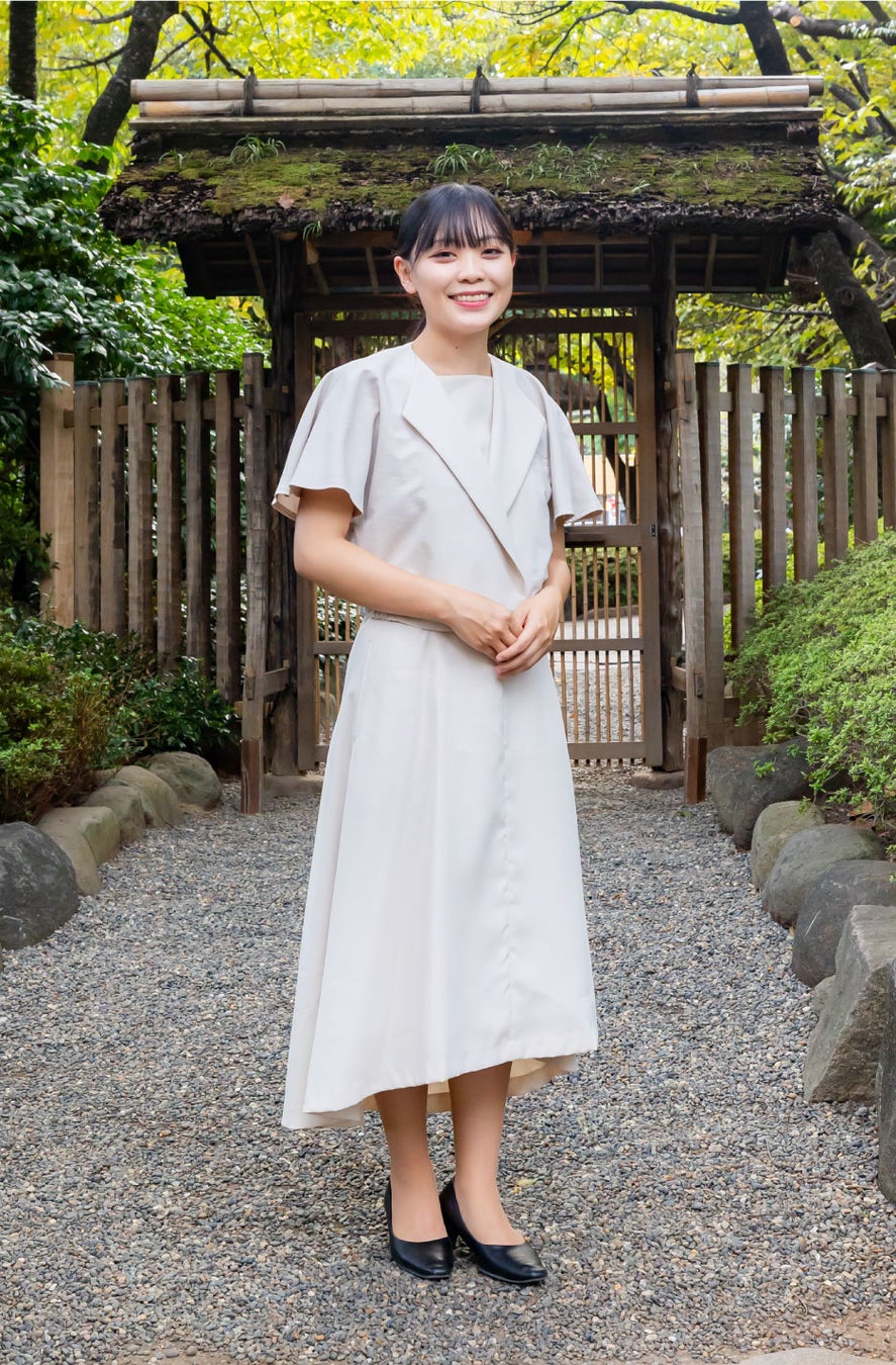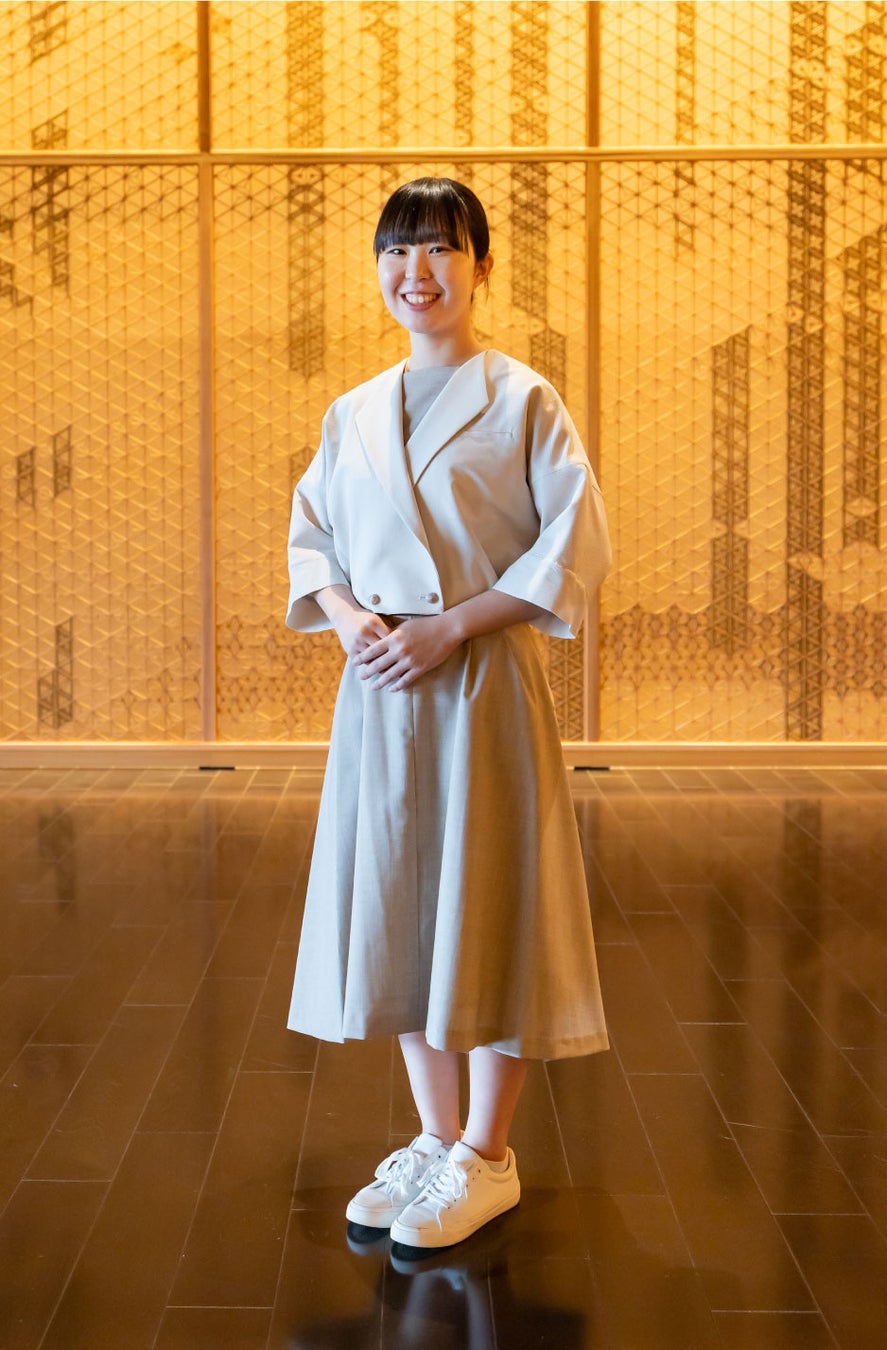 女性は上着にはシアサッカー、スカートにはポリエステル素材を用いた異素材の組み合わせにより、晴れやかさと実務性を両立。上着のリボンには西陣織の老舗「HOSOO」のファブリックを用いた西陣織を取り入れ、ほかのセクション同様に日本の美意識を凝縮しています。女性はパンツとスカートを選択可能。さらに、これまでは必須だった上着も春夏は着脱可能とし、進行に伴う動きやすさや個々の働き方に寄り添う運用性を高めました。装いに機能美を重ねることで、「日本の、美意識の凝縮」を日々の現場で実感できるデザインに仕上げています。