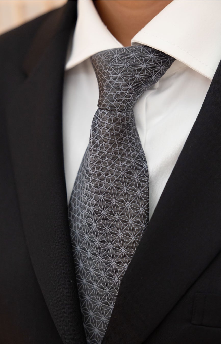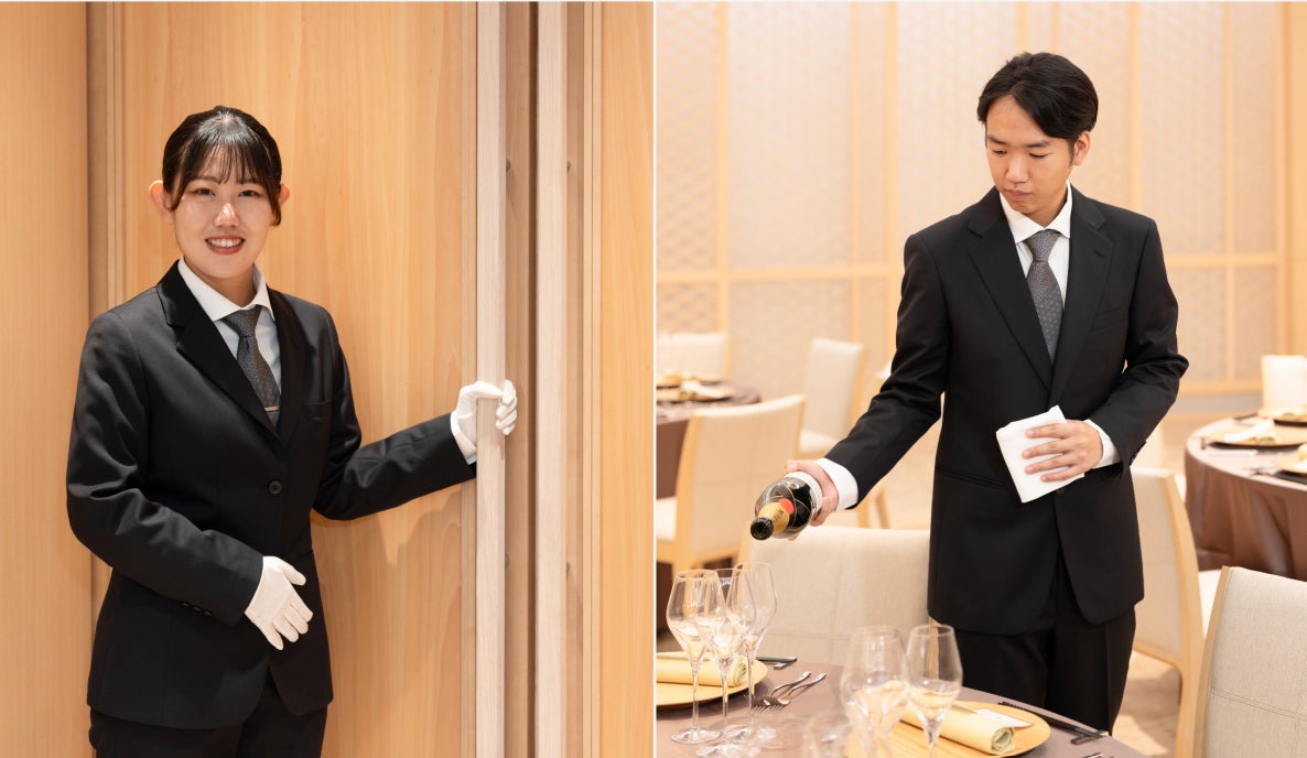 ご結婚式や各種ご宴席を担うバンケットサービスセクションのキャプテン(責任者)は、この度のリブランディングにより一新したメインロビーの壁面を飾る、福岡県大川市の伝統工芸「大川組子」の文様をモチーフにしたオリジナルネクタイ(写真右)を着用します。精緻な幾何学がVゾーンに端正な陰影を生み、都市庭園の静謐さと現代的な正装のバランスを表現。「日本の美意識を纏う」のコンセプトのもと、節度ある華やぎで“日本の、美意識の凝縮”をさりげなく体現します。