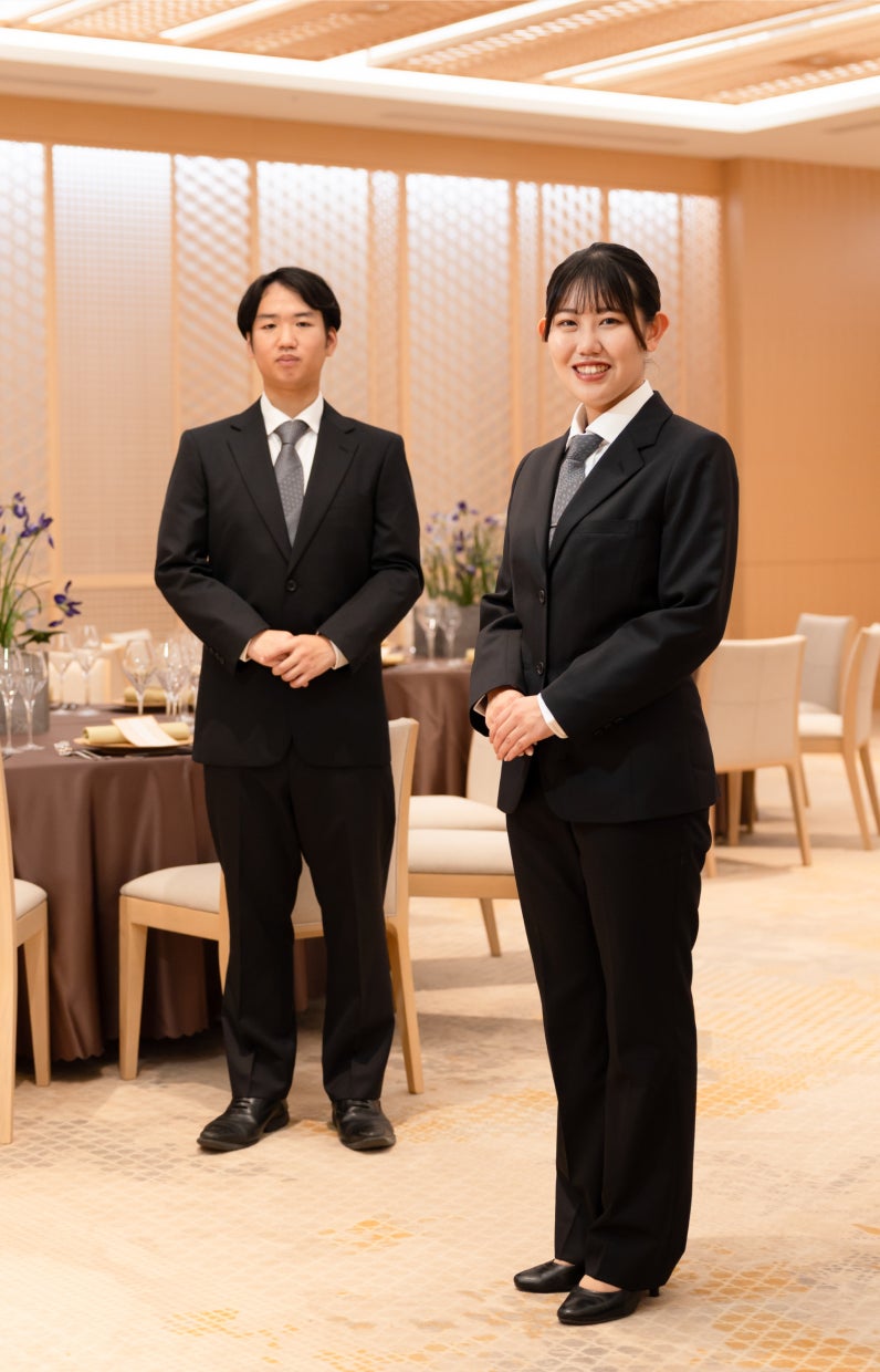 コンシェルジュセクション、ゲストリレーションセクション、ブライダルセクションの新ユニフォームには、西陣織の老舗「HOSOO」のファブリックを用いたくるみボタンがあしらわれています。この細部へのこだわりが、庭園に調和する品位ある華やぎと所作の美しさを際立たせるディテールのひとつとなり、「日本の美意識を纏う」を体現しています。