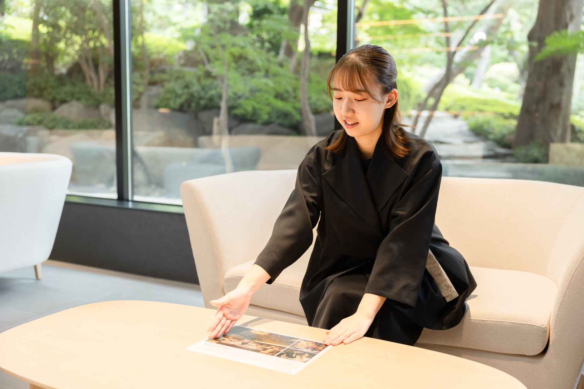 男女ともに館内外を縦横に移動する業務特性に合わせて機動性を確保しつつ、素材の表情で庭園の四季と響き合うデザインとし、日常の接遇の中で自然体に日本の美意識を纏える仕様としました。