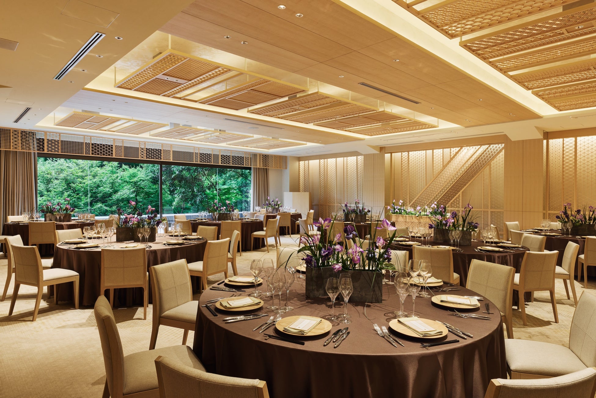 太陽の光が差し込み、まるで木漏れ日の中にいるような心地よさを感じられる、温もりに満ちたバンケット。寄木の宝箱をモチーフにし、八芳園の庭園が目の前に広がる、自然美と伝統美が共存する「KIOTO」。会場ご利用の方専用のテラススペースもあり、プライベート感あふれる空間となっています。