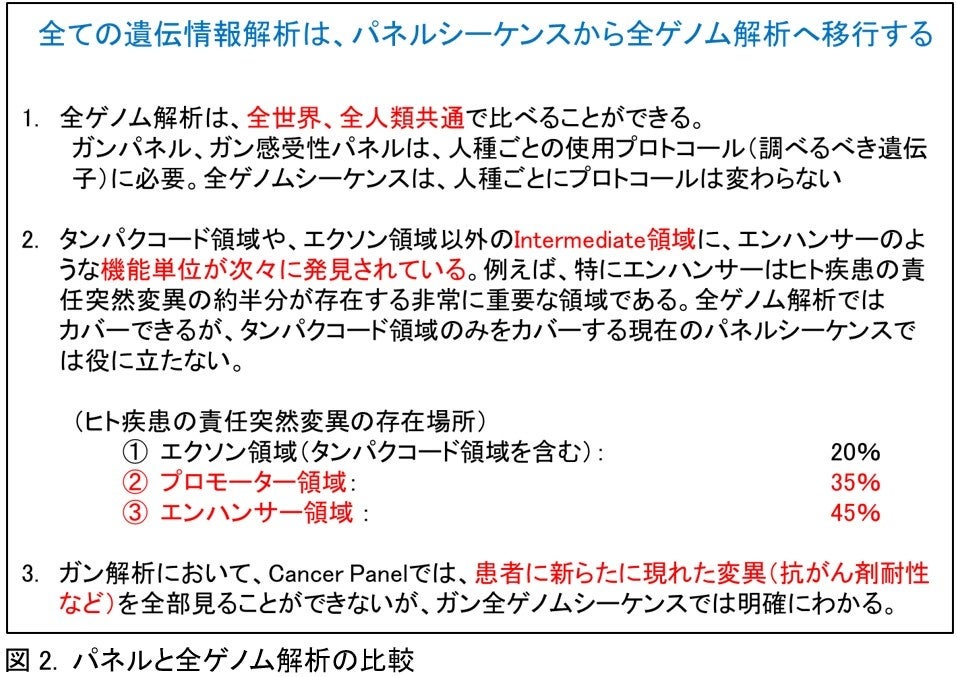 従来は、シーケンスコストが高かったために、シーケンスする領域のみを絞ったパネルシーケンスしたほうが、全ゲノムシーケンスよりシーケンスコストが安くつき、解析するべき情報が少ないため情報解析の計算機資源も小規模安価で済むという評価が下されていた。しかし、近年、標的領域を濃縮するためのアンプリコン法の増幅試薬に係る値段や、ハイブリダイゼーションのためのチップの値段のほうが、シーケンスコストより高くつき、さらに、全ゲノムシーケンスのほうがライブラリーの作成がはるかに簡単で迅速であり、一回の実験で得られる情報量もはるかに多いので、パネルシーケンスよりも全ゲノムシーケンスに解析戦略が転換しつつある。そのうえ、今回のAAS-G1の出現により、解析の計算機資源もはるかに安価になったために、あらゆる意味で全ゲノム解析がパネルシーケンスよりも科学的に安価で有意義なデータが出せるため、パネルシーケンスに置き換わりつつある。