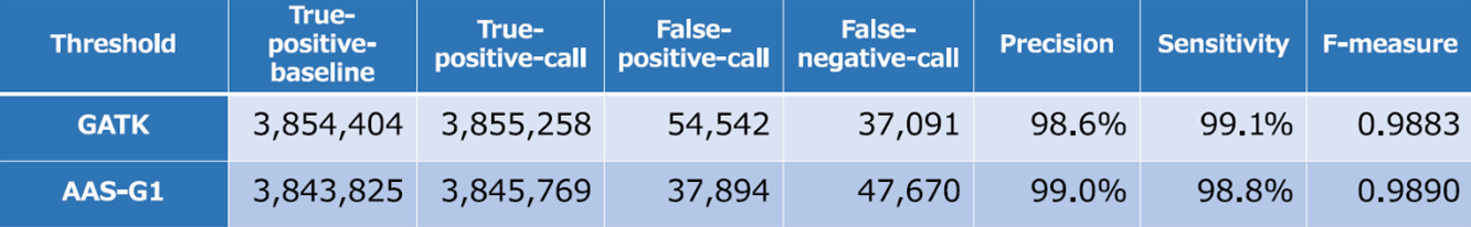 米国FDAが実施しているGolden Standardのゲノム配列を利用したゲノム1次解析の正確性評価システム(Precision FDA truth challegeV2 https://precision.fda.gov/challenges/10) のデータを用いた正確性スコア(F1 Score)は、99.0%であり、(F‐measure:0.989)、精度はBWA-MEM+GATKを用いたものときよりも高水準だった。