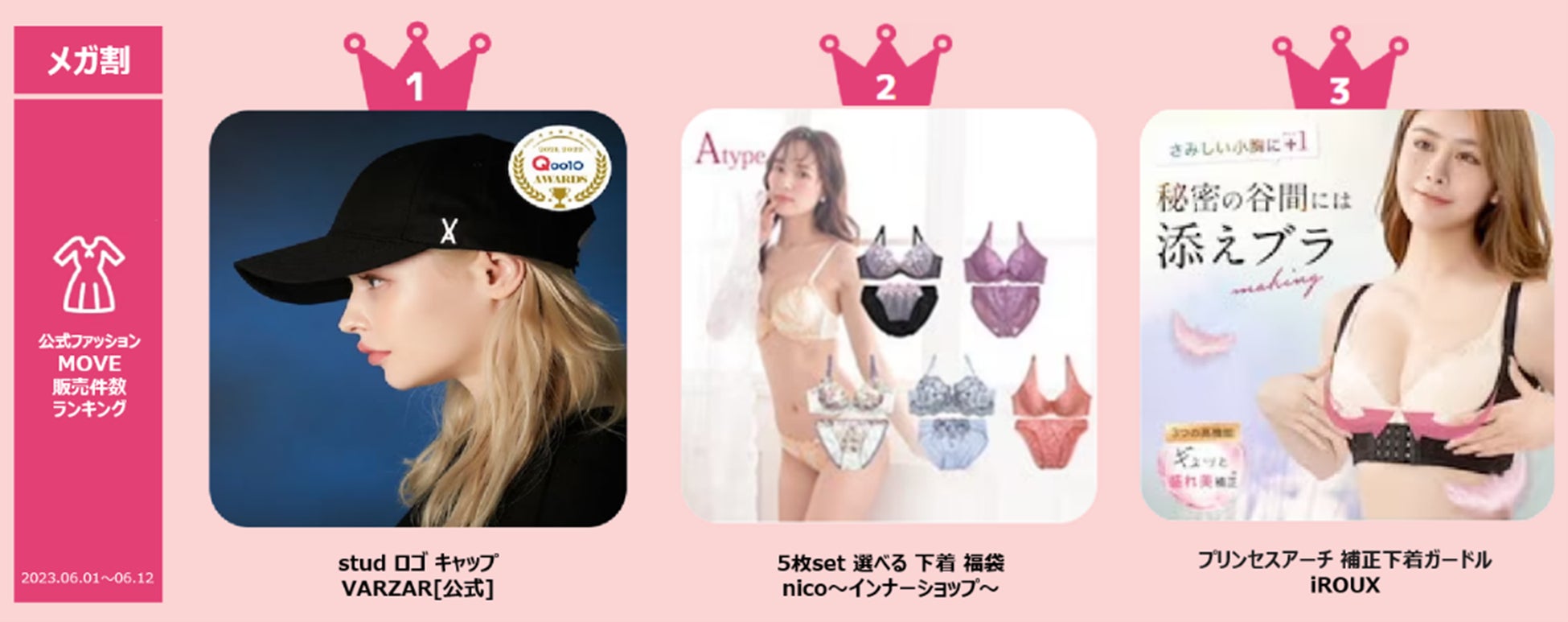 MOVEではメガ割前に、K-POPアイドルや日本の芸能人などの着用画像がSNS上で掲載されていたことが大きな起因となり、VARZARのキャップが初日から好調で、過去最高の件数、売上となりました。また、下着の人気は堅調で、特にセット品や話題の「プリンセスアーチ」のナイトブラが過去最高の売上となり、メガ割後も順調で入荷が追い付かず、現在予約販売となっています。その他、スポーツサンダルやオーバーサイズTシャツも好調でした。
