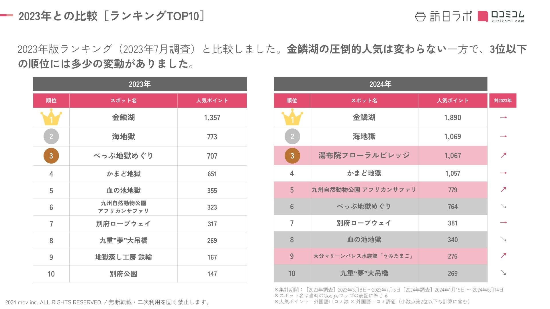 また、人気スポットは別府・湯布院エリアに集中しました。